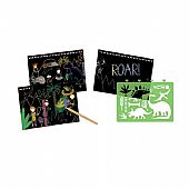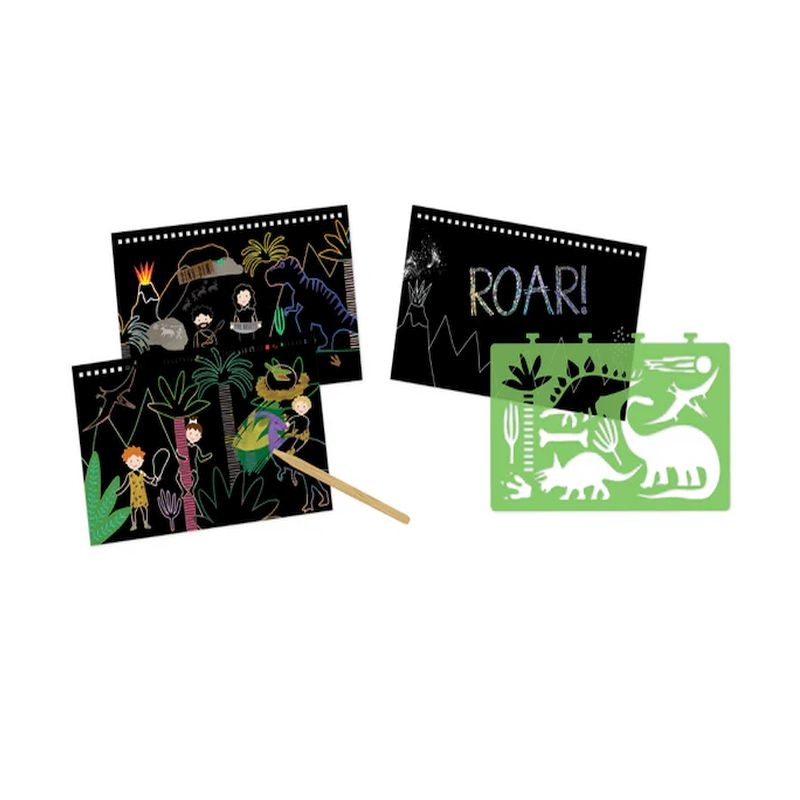 Ξύστε και παίξτε! Ατελείωτες ώρες δημιουργικής διασκέδασης που μπορείτε να απολαύσετε με αυτά τα βιβλία με σπειροειδή βιβλιοδεσία. Μέσα θα βρείτε 10 προεκτυπωμένα φύλλα που περιέχουν δεινόσαυρους. Χρησιμοποιώντας την ξύλινη γραφίδα που περιλαμβάνεται, μπορείτε να ξύσετε για να «χρωματίσετε», να δημιουργήσετε νέες γραμμές ή χρωματιστά σχήματα. Η κάρτα στένσιλ που περιλαμβάνεται μπορεί να αφαιρεθεί και να τοποθετηθεί οπουδήποτε στο βιβλίο, πράγμα που σημαίνει ότι μπορείτε να ακολουθήσετε τις οδηγίες για να ξύσετε τους δεινόσαυρους που απεικονίζονται!