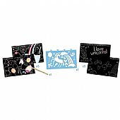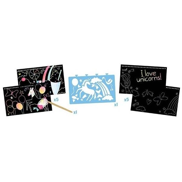 Το σετ περιλαμβάνει: 10 scratch φύλλα, 1 ξύλινη γραφίδα και 1 αφαιρούμενο φύλλο στένσιλ.