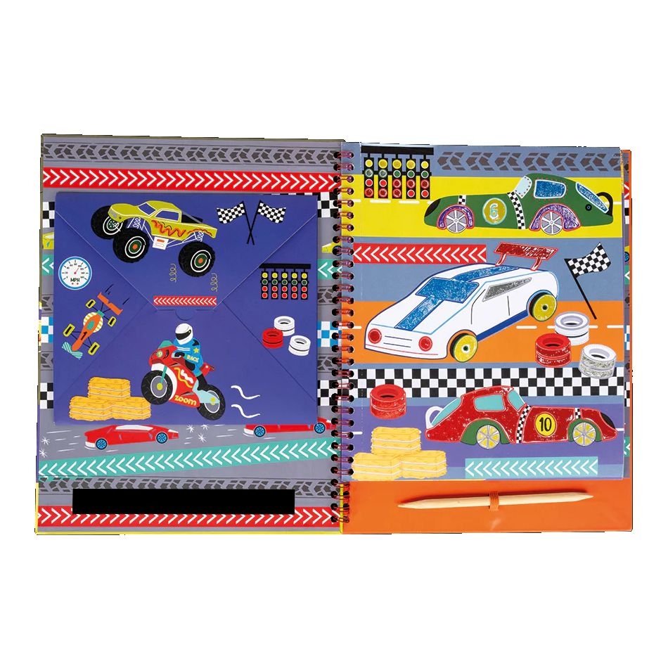 Κάντε τα πάντα να λαμπυρίζουν και να λάμπουν με αυτές τις 8 διασκεδαστικές εικονογραφημένες σελίδες που είναι έτοιμες για διακόσμηση! Ξεκολλήστε το λευκό αυτοκόλλητο, επιλέξτε ένα φύλλο από τα λαμπερά αλουμινόχαρτα και τρίψτε το στην περιοχή του αυτοκόλλητου, χρησιμοποιώντας την ξύλινη γραφίδα για να δημιουργήσετε μια εκπληκτική εικόνα! Αυτό το σχέδιο Cars περιέχει 30 διαφορετικά λαμπερά αλουμινόχαρτα, 8 σελίδες και μια ξύλινη γραφίδα – όλα σε ένα εύχρηστο σπιράλ βιβλίο.