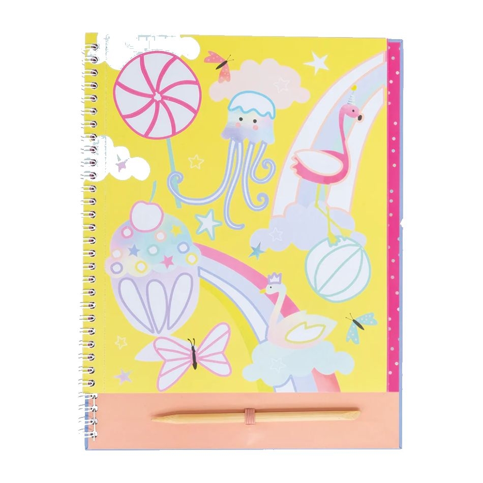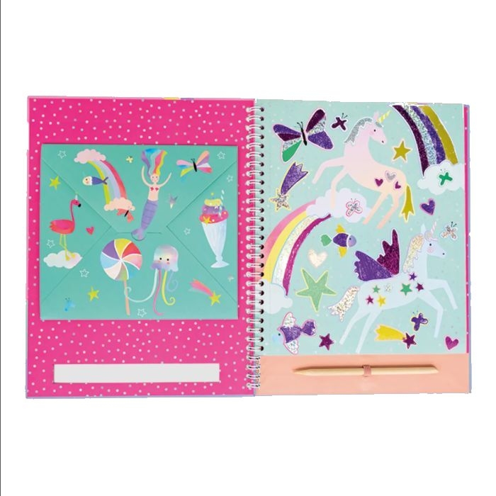 Κάντε τα πάντα να λαμπυρίζουν και να λάμπουν με αυτές τις 8 διασκεδαστικές εικονογραφημένες σελίδες που είναι έτοιμες για διακόσμηση! Ξεκολλήστε το λευκό αυτοκόλλητο, επιλέξτε ένα φύλλο από τα λαμπερά αλουμινόχαρτα και τρίψτε το στην περιοχή του αυτοκόλλητου, χρησιμοποιώντας την ξύλινη γραφίδα για να δημιουργήσετε μια εκπληκτική εικόνα! Αυτό το σχέδιο Φαντασία περιέχει 30 διαφορετικά λαμπερά αλουμινόχαρτα, 8 σελίδες και μια ξύλινη γραφίδα – όλα σε ένα εύχρηστο σπιράλ βιβλίο.