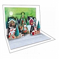 Η POP-UP Χριστουγεννιάτικη κάρτα με λεκτικό "Χαρούμενες γιορτές" περιέχεται σε ένα σελοφάν μαζί με ένα κόκκινο φάκελο. Ανοίγει ως αναδυόμενη και εμφανίζεται το σχέδιο της εικόνας.