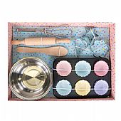 Το σετ περιλαμβάνει: 3 κουπάτ μπισκότων, 1 πλάστη, 1 σύρμα, 1 κουταλιά μίξερ, 1 μπολ, 1 μπλοκ συνταγών και 24 θήκες για cupcakes.