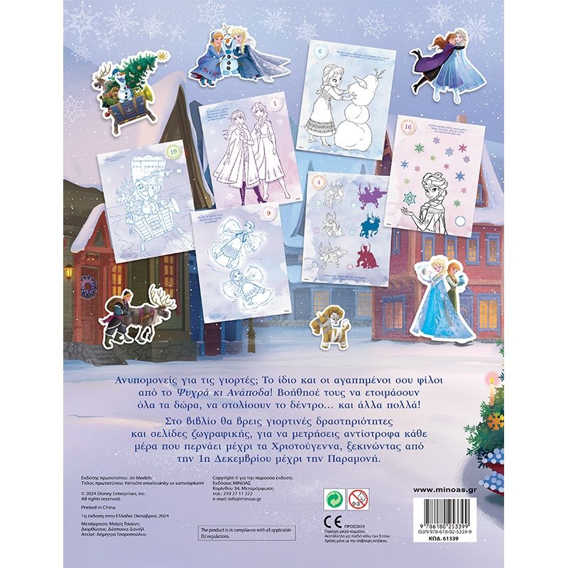 Ανυπομονείς για τις γιορτές; Το ίδιο και οι αγαπημένοι σου φίλοι από το Ψυχρά κι Ανάποδα! Βοήθησέ τους να ετοιμάσουν όλα τα δώρα, να στολίσουν το δέντρο… και άλλα πολλά! Στο βιβλίο θα βρεις γιορτινές δραστηριότητες και σελίδες ζωγραφικής, για να μετρήσεις αντίστροφα κάθε μέρα που περνάει μέχρι τα Χριστούγεννα, ξεκινώντας από την 1η Δεκεμβρίου μέχρι την Παραμονή.