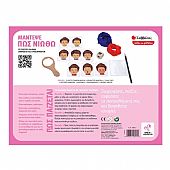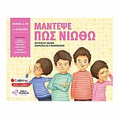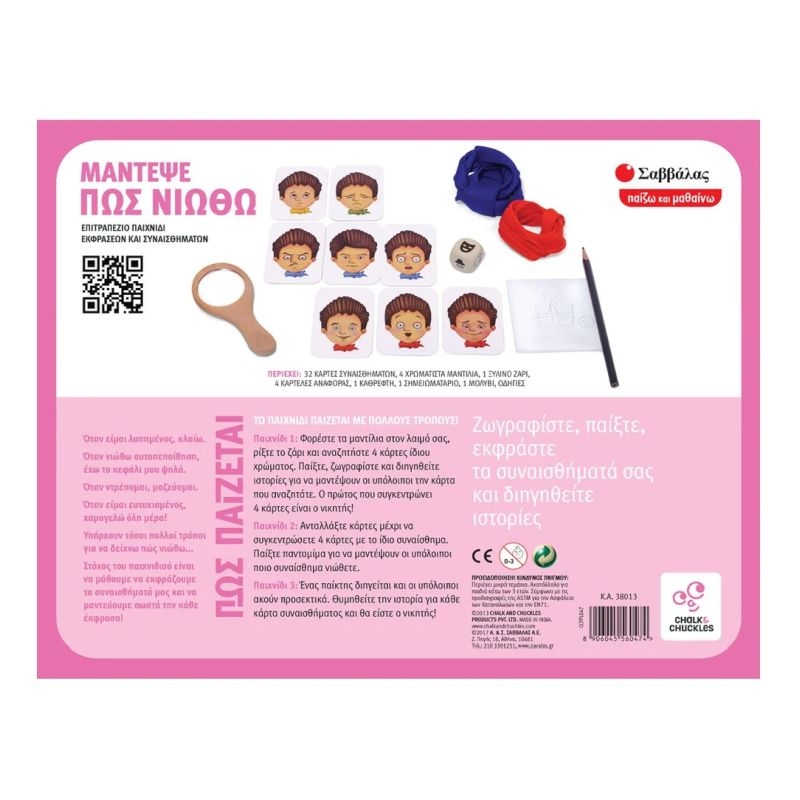 Περιλαμβάνει: 32 κάρτες συναισθημάτων, 4 χρωματιστά μαντίλια, 1 ξύλινο ζάρι, 4 καρτέλες αναφοράς, 1 καθρέφτη, 1 σημειωματάριο, μολύβι και φυλλάδιο με οδηγίες.