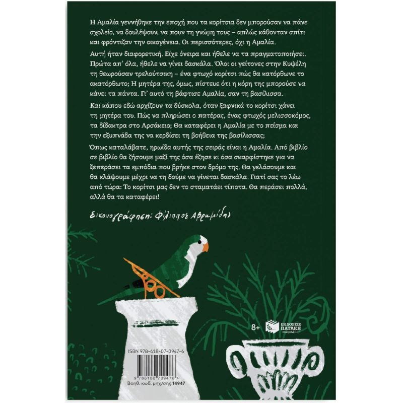 Η Αμαλία γεννήθηκε την εποχή που τα κορίτσια δεν μπορούσαν να πάνε σχολείο, να δουλέψουν, να πουν τη γνώμη τους – απλώς κάθονταν σπίτι και φρόντιζαν την οικογένεια. Οι περισσότερες, όχι η Αμαλία. Αυτή ήταν διαφορετική. Είχε όνειρα και ήθελε να τα πραγματοποιήσει. Πρώτα απ’ όλα, ήθελε να γίνει δασκάλα. Όλοι οι γείτονες στην Κυψέλη τη θεωρούσαν τρελούτσικη – ένα φτωχό κορίτσι πώς θα κατόρθωνε το ακατόρθωτο; Η μητέρα της, όμως, πίστευε ότι η κόρη της μπορούσε να κάνει τα πάντα. Γι’ αυτό τη βάφτισε Αμαλία, σαν τη βασίλισσα. Και κάπου εδώ αρχίζουν τα δύσκολα, όταν ξαφνικά το κορίτσι χάνει τη μητέρα του. Πώς να πληρώσει ο πατέρας, ένας φτωχός μελισσοκόμος, τα δίδακτρα στο Αρσάκειο; Θα καταφέρει η Αμαλία με το πείσμα και την εξυπνάδα της να κερδίσει τη βοήθεια της βασίλισσας; Όπως καταλάβατε, ηρωίδα αυτής της σειράς είναι η Αμαλία. Από βιβλίο σε βιβλίο θα ζήσουμε μαζί της όσα έζησε κι όσα σκαρφίστηκε για να ξεπεράσει τα εμπόδια που βρήκε στον δρόμο της. Θα γελάσουμε και θα κλάψουμε μέχρι να τη δούμε να γίνεται δασκάλα. Γιατί σας το λέω από τώρα: Το κορίτσι μας δεν το σταματάει τίποτα. Θα περάσει πολλά, αλλά θα τα καταφέρει!