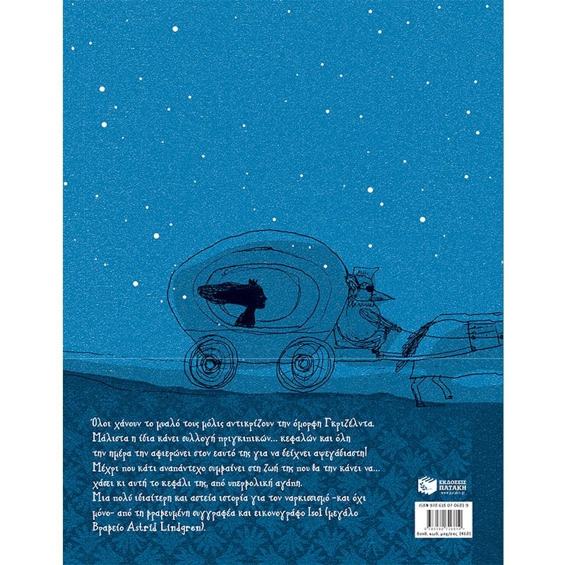 Όλοι χάνουν το μυαλό τους μόλις αντικρίζουν την όμορφη Γκριζέλντα. Μάλιστα η ίδια κάνει συλλογή πριγκιπικών… κεφαλών και όλη την ημέρα την αφιερώνει στον εαυτό της για να δείχνει αψεγάδιαστη! Μέχρι που κάτι αναπάντεχο συμβαίνει στη ζωή της που θα την κάνει να… χάσει κι αυτή το κεφάλι της, από υπερβολική αγάπη. Μια πολύ ιδιαίτερη και αστεία ιστορία για τον ναρκισσισμό -και όχι μόνο- από τη βραβευμένη συγγραφέα και εικονογράφο Isol (μεγάλο Βραβείο Astrid Lindgren). «Είμαι ενθουσιασμένη που το βιβλίο αυτό εκδόθηκε στα ελληνικά από τις Εκδόσεις Πατάκη· για την ακρίβεια, χάνω το μυαλό μου από ευτυχία! Εύχομαι οι Έλληνες αναγνώστες να απολαύσουν το τρελό αυτό παραμύθι που εμπνεύστηκα από τη μεσαιωνική τέχνη, τα ερωτικά τραγούδια και την ίδια τη ζωή».