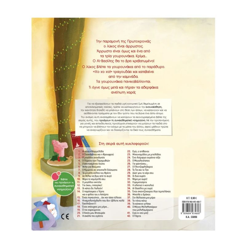 Την παραμονή της Πρωτοχρονιάς ο λύκος είναι άρρωστος. Άρρωστο είναι όμως και ένα από τα τρία γουρουνάκια. Κρίμα... Ο Αϊ-Βασίλης θα το βρει κρεβατωμένο! Ο λύκος βλέπει τα γουρουνάκια από το παράθυρο. "Χο χο χο!" τραγουδάει και κατεβαίνει από την καμινάδα. Τα γουρουνάκια πανικοβάλλονται. Τι έγινε όμως μετά και πήραν τα αδερφάκια ανείπωτη χαρά; Για να εξασφαλίσουν τα παιδιά υγιή κοινωνική ζωή θεμελιωμένη σε αποτελεσματικές σχέσεις, πρέπει να καλλιεργήσουν την ενσυναίσθηση, την ικανότητα δηλαδή να μπαίνουν στη θέση των άλλων, να κατανοούν και να αισθάνονται πράγματα με τον ίδιο τρόπο που τα βιώνει ένα άλλο άτομο.Την ανάγκη αυτή αναλαμβάνουν να καλύψουν τα εικονογραφημένα βιβλία της σειράς αυτής, που προάγουν τη συναισθηματική νοημοσύνη. Με την προτεινόμενη για γονείς και εκπαιδευτικούς προσέγγιση επιχειρούν να μυήσουν τα παιδιά στο να μπορούν να βλέπουν τον κόσμο με τα μάτια του άλλου, αφού μάθουν πρώτα να αναγνωρίζουν και να διαχειρίζονται τα δικά τους συναισθήματα.