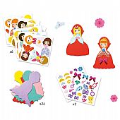 Περιλαμβάνει: 6 φύλλα από 4 αυτοκόλλητα πρόσωπα το κάθε ένα, 24 σώματα από τσόχα και 2 φύλλα με αυτοκόλλητα στέμματα.
