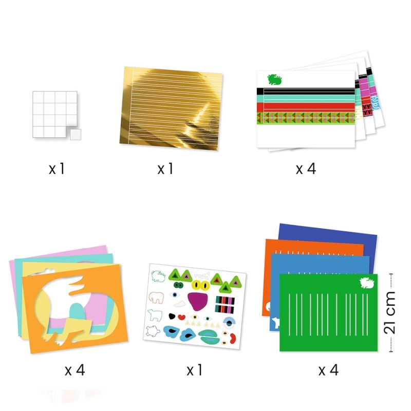 Περιλαμβάνει: 4 κάρτες με ζώα, 4 προκομμένες κάρτες, 4 φύλλα με πολύχρωμες λωρίδες, 1 φύλλο με χρυσές μεταλλικές λωρίδες, 1 σελίδα με αυτοκόλλητα, αυτοκόλλητα διπλής όψης και εικονογραφημένες οδηγίες.