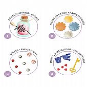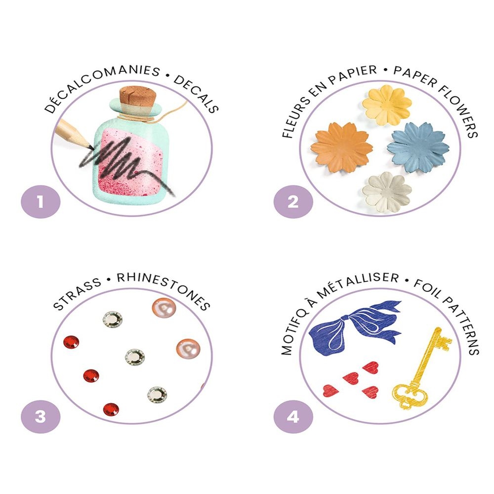 Περιλαμβάνει: χαλκομανίες, χάρτινα λουλούδια, 100 αυτοκόλλητα στρας και διάφορα σχέδια για διακόσμηση με αλουμινόχαρτο και φυλλάδιο οδηγίες βήμα προς βήμα.