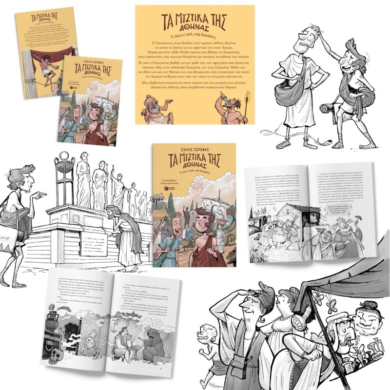 Στο βιβλίο “Τα μυστικά της Αθήνας – Τι λες κι εσύ, κυρ Σωκράτη;” περπατάμε στην Αγορά παρέα με δυο δούλους, τον Γάστρωνα και τον Ατωτάκη, και δίπλα τους μαθαίνουμε θαυμαστές, ίσως απίστευτες, και σίγουρα δοσμένες με χιούμορ συνήθειες της εποχής. Σε αυτή τη βόλτα ο Γάστρωνας μας αφηγείται όσα έζησε και άκουσε πλάι στον φιλόσοφο Σωκράτη, τον δικό του κυρ Σωκράτη. Με δέος και θαυμασμό μιλά για τις ιδέες του και καταλήγει στην καταδίκη του και στον θρυλικό θάνατό του. Ο συναρπαστικός κόσμος των δύο δούλων ζωντανεύει στο κέντρο της Αθήνας, γι’ αυτό στο βιβλίο περιλαμβάνεται χάρτης με τα μέρη και τα μνημεία που επισκέπτεται ο Γάστρωνας, αλλά και μεταγενέστερα μνημεία με βασικές κατατοπιστικές πληροφορίες. Έτσι ο σύγχρονος αναγνώστης μπορεί να ζωντανέψει την αρχαία Αθήνα και παράλληλα να αναγνωρίσει την πόλη με τη σημερινή της μορφή και να παρακολουθήσει την εξέλιξή της στον χρόνο. Η διασκεδαστική βόλτα της ιστορίας μπορεί να γίνει πραγματική βόλτα με μια περιήγηση στην αρχαία Αγορά, σήμερα. “Τα μυστικά της Αθήνας” είναι ένας διαφορετικός τουριστικός οδηγός. Καλή περιήγηση… μέχρι την επόμενή μας βόλτα, όταν ο Σάκης Σερέφας φέρει στο φως μια άλλη πόλη και την ιστορία της.