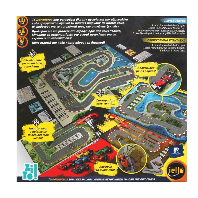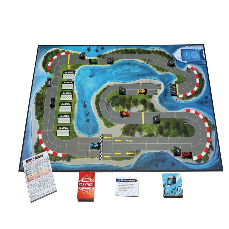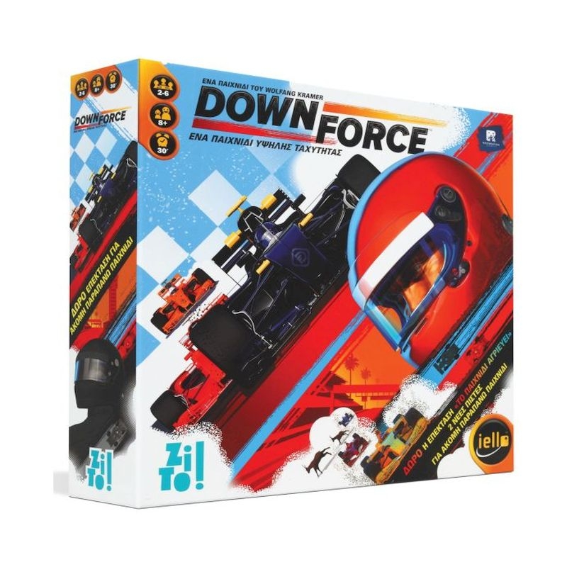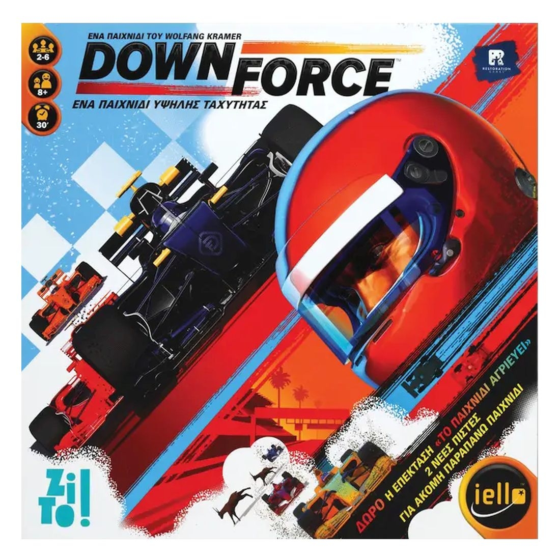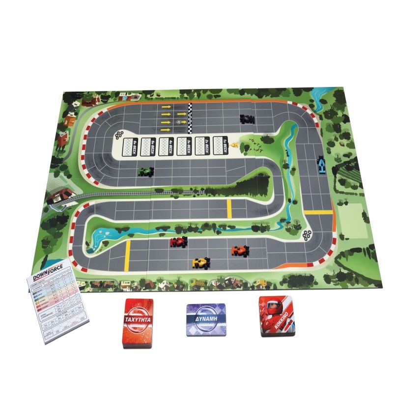 To Downforce σού μεταφέρει όλη την αγωνία και την αδρεναλίνη ενός πραγματικού αγώνα F1! Οι παίκτες παίρνουν τις κάρτες τους, πλειοδοτούν για τα μονοθέσιά τους... και ο αγώνας ξεκινάει. Προλαβαίνετε να φτάσετε στη στροφή πριν από τους άλλους; Μπορείτε να στοιχηματίσετε στο σωστό αυτοκίνητο για να κερδίσετε το στοίχημά σας; Κάθε στροφή και κάθε κάρτα κάνουν τη διαφορά!