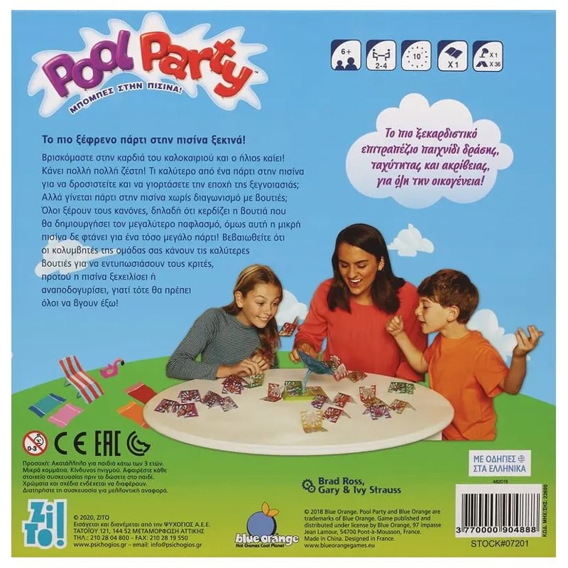 Βρισκόμαστε στην καρδιά του καλοκαιριού και ο ήλιος καίει! Κάνει πολλή πολλή ζέστη! Τι καλύτερο από ένα πάρτι στην πισίνα για να δροσιστείτε και να γιορτάσετε την εποχή της ξεγνοιασιάς; Αλλά γίνεται πάρτι στην πισίνα χωρίς διαγωνισμό με βουτιές; Όλοι ξέρουν τους κανόνες, δηλαδή ότι κερδίζει η βουτιά που θα δημιουργήσει τον μεγαλύτερο παφλασμό, όμως αυτή η μικρή πισίνα δε φτάνει για ένα τόσο μεγάλο πάρτι! Βεβαιωθείτε ότι οι κολυμβητές της ομάδας σας κάνουν τις καλύτερες βουτιές για να εντυπωσιάσουν τους κριτές, προτού η πισίνα ξεχειλίσει ή αναποδογυρίσει, γιατί τότε θα πρέπει όλοι να βγουν έξω! Το πιο ξεκαρδιστικό επιτραπέζιο παιχνίδι δράσης, ταχύτητας και ακρίβειας, για όλη την οικογένεια!