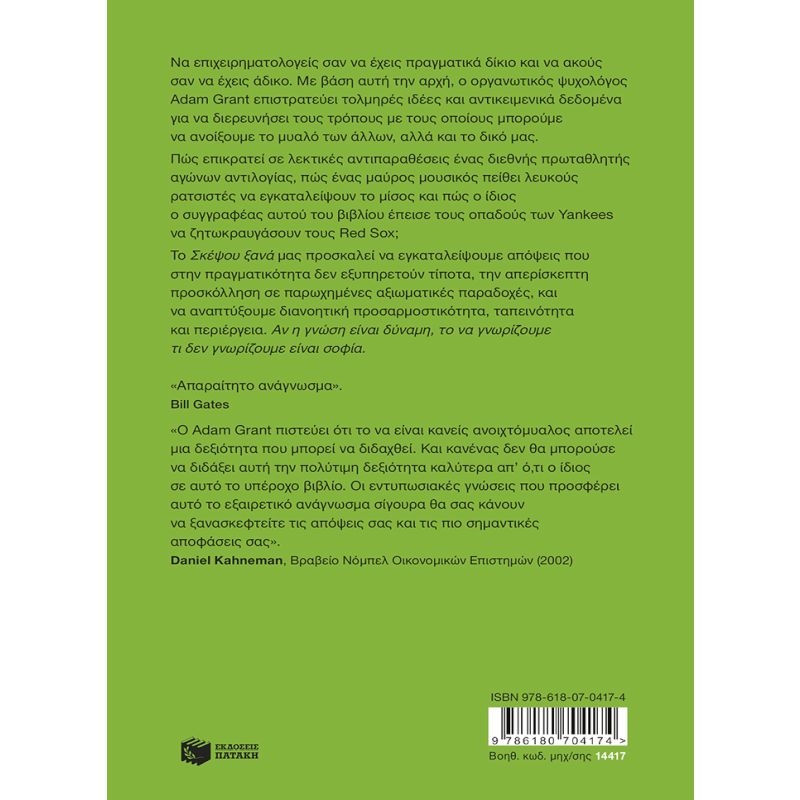 Nα επιχειρηματολογείς σαν να έχεις πραγματικά δίκιο και να ακούς σαν να έχεις άδικο. Με βάση αυτή την αρχή, o οργανωτικός ψυχολόγος Adam Grant επιστρατεύει τολμηρές ιδέες και αντικειμενικά δεδομένα για να διερευνήσει τους τρόπους με τους οποίους μπορούμε να ανοίξουμε το μυαλό των άλλων, αλλά και το δικό μας. Πώς επικρατεί σε λεκτικές αντιπαραθέσεις ένας διεθνής πρωταθλητής αγώνων αντιλογίας, πώς ένας μαύρος μουσικός πείθει λευκούς ρατσιστές να εγκαταλείψουν το μίσος και πώς ο ίδιος ο συγγραφέας αυτού του βιβλίου έπεισε τους οπαδούς των Yankees να ζητωκραυγάσουν τους Red Sox; Το Σκέψου ξανά μας προσκαλεί να εγκαταλείψουμε απόψεις που στην πραγματικότητα δεν εξυπηρετούν τίποτα, την απερίσκεπτη προσκόλληση σε παρωχημένες αξιωματικές παραδοχές, και να αναπτύξουμε διανοητική προσαρμοστικότητα, ταπεινότητα και περιέργεια. Αν η γνώση είναι δύναμη, το να γνωρίζουμε τι δεν γνωρίζουμε είναι σοφία.