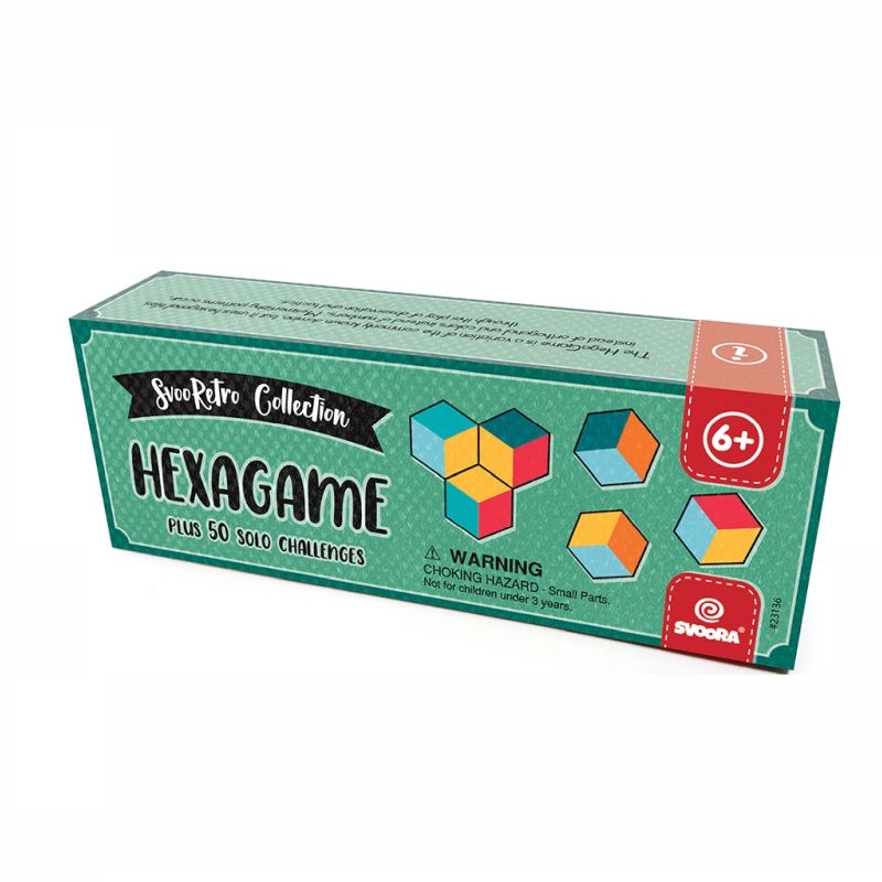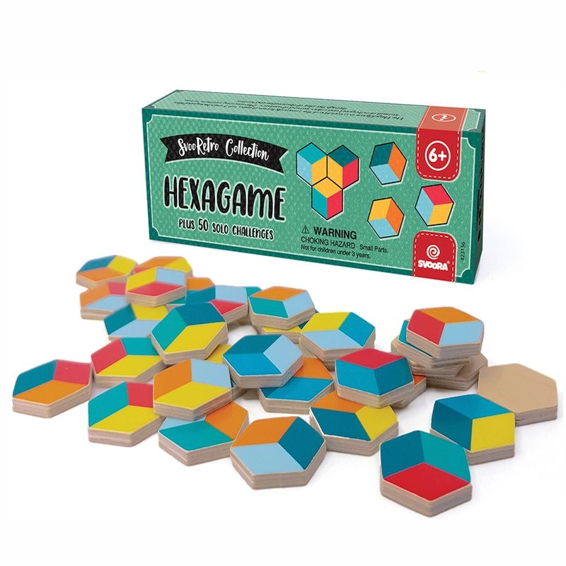 Το 'HexaGame' από τη σειρά SvooRetro της εταιρίας Svoora είναι ένα δημιουργικό παιχνίδι τοποθέτησης των ξύλινων πλακιδίων το ένα δίπλα στο άλλο, με βάση τα χρώματα των εφαπτόμενων πλευρών τους ή της επίλυσης των 50 προκλήσεων ενός παίκτη, που περιλαμβάνονται στο εγχειρίδιο. Με την ενασχόληση με αυτήν την σπαζοκεφαλιά, τα παιδιά περνούν στιγμές διασκέδασης με την οικογένεια και εξασκούν την παρατηρητικότητά τους, ενισχύουν την λεπτή κινητικότητά τους, ενώ παράλληλα εισάγονται στην πρακτική έννοια της στρατηγικής σκέψης. Είναι κατασκευασμένο αποκλειστικά από ξύλο οξιάς χωρίς αιχμηρές γωνίες και τοξικές επικαλύψεις χρωμάτων, για ασφαλή χρήση. Είναι φορητό για διασκέδαση χωρίς περιορισμούς, οπουδήποτε