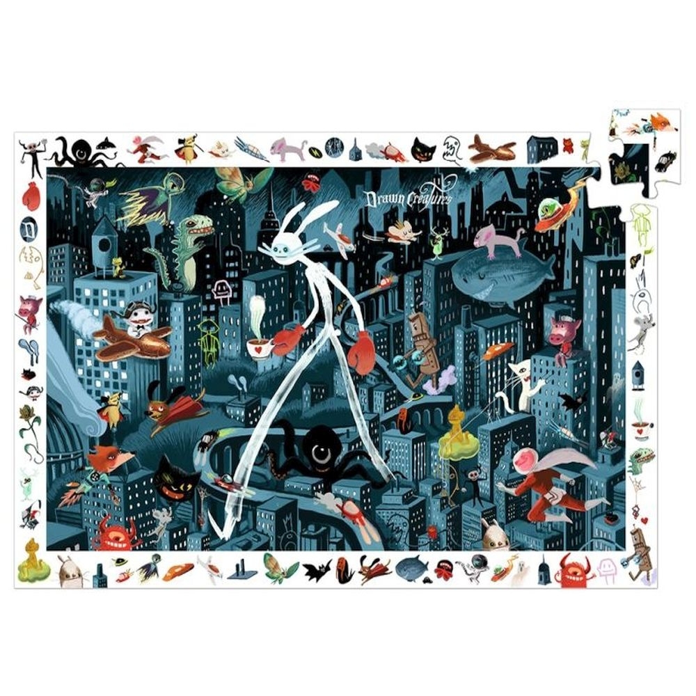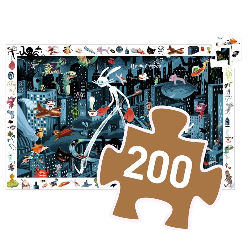 Που είναι κρυμμένη η παράξενη νυχτερίδα και σε ποιο δρόμο κινείται το διαστημικό αυτοκίνητο; Συνθέστε το παζλ, για να το ανακαλύψετε! Παζλ της εταιρείας Djeco που περιλαμβάνει 200 κομμάτια υψηλής ποιότητας, κατασκευασμένα από ανθεκτικό πεπιεσμένο χαρτόνι, καθώς και μια αφίσα με την εικόνα του παζλ. Τα παιδιά καλούνται να κατασκευάσουν το παζλ και στη συνέχεια να παρατηρήσουν τα αντικείμενα που υπάρχουν περιμετρικά στην εικόνα, έτσι ώστε να τα εντοπίσουν μέσα στο παζλ. Μια εκπαιδευτική δραστηριότητα που καλλιεργεί τη συγκέντρωση, την υπομονή και την παρατηρητικότητα των παιδιών και αναπτύσσει τον συντονισμό χεριού – ματιού τους.