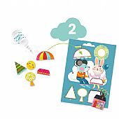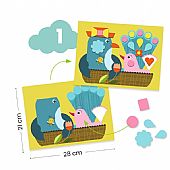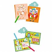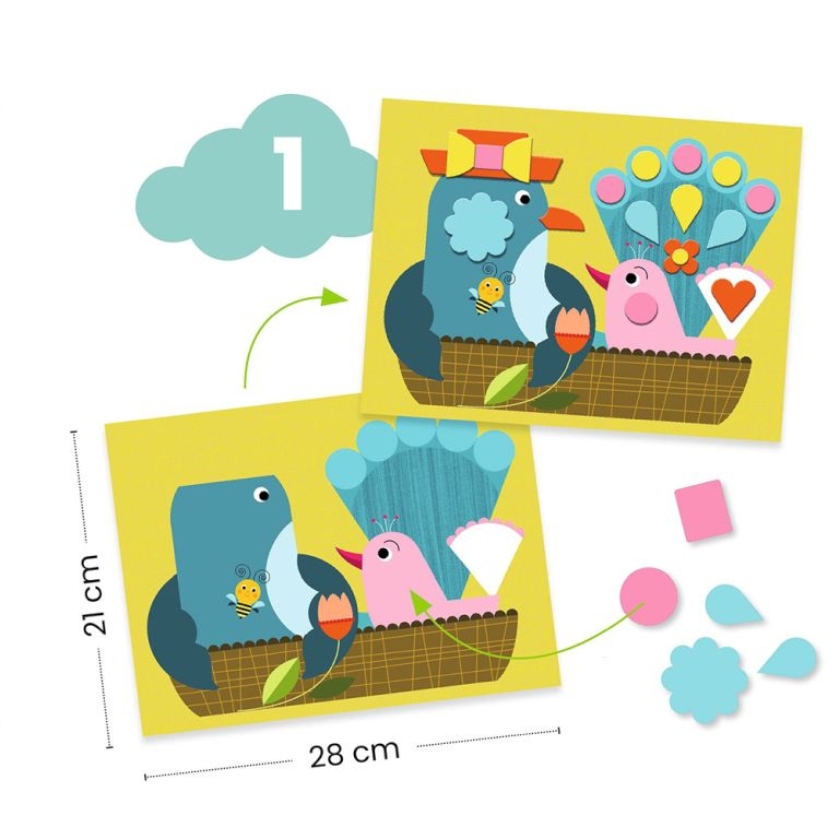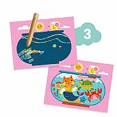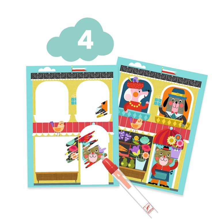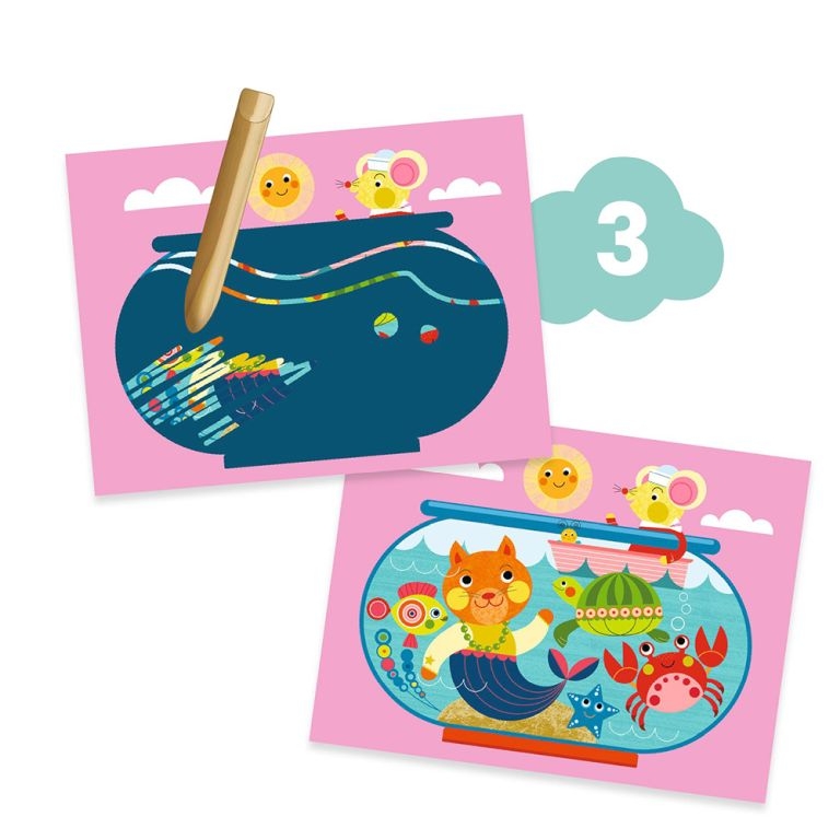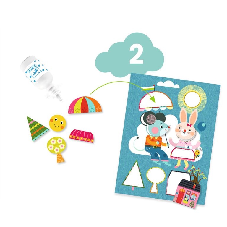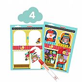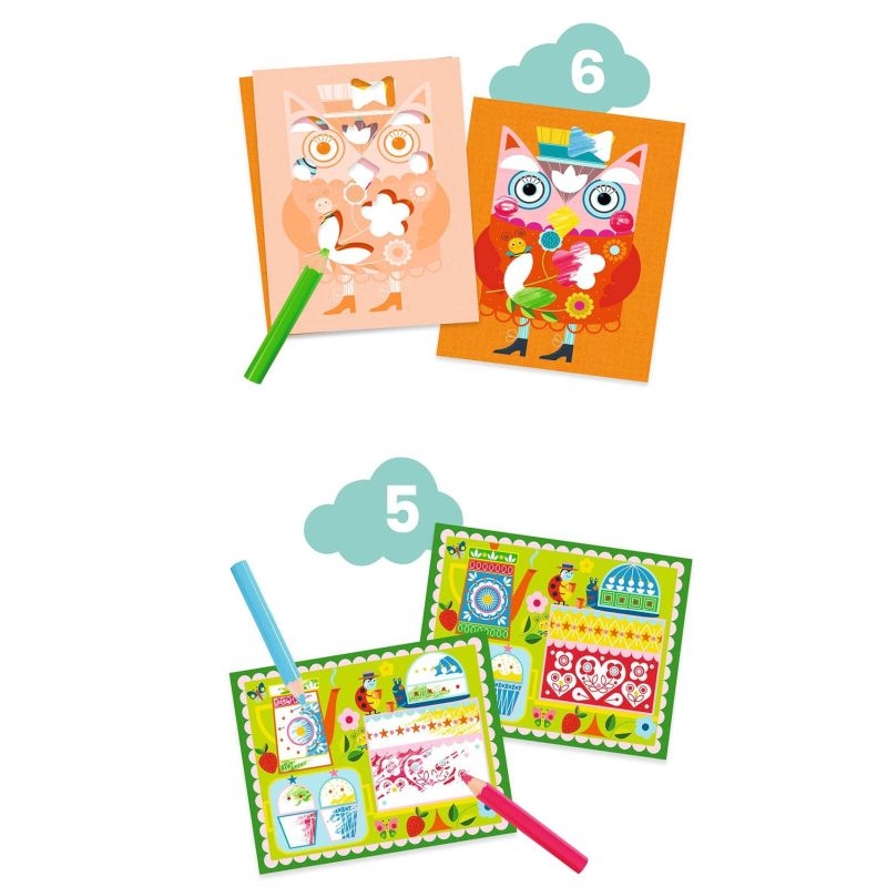 Περιλαμβάνει: 1 κολάζ με 8 σχεδιάκια και κόλλα, 1 κολλάζ από τσόχα με 18 κομμάτια, 3 εικόνες για αποκάλυψη και 4 ξυλομπογιές, 3 ξυστές κάρτες και ένα μολύβι για ξύσιμο, 4 οριοθετημένα χαρτιά με 4 ξυλομπογιές, 1 επιφάνεια για χρωματισμό με νερό και τον σχετικό μαρκαδόρο, οδηγίες χρήσης.