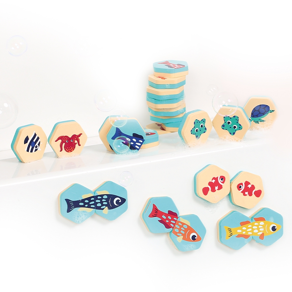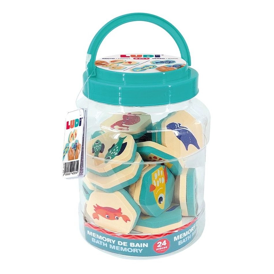 Το μπάνιο και η διασκέδαση πηγαίνουν μαζί με το 2 σε 1 παιχνίδι μνήμης & παζλ της εταιρείας Ludi. Ένα παιχνίδι που επιτρέπει στο παιδί να αναπτύξει και κατά τη διάρκεια του μπάνιου, την ικανότητά του για παρατήρηση & συγκέντρωση. Αποτελείται από 24 αδιάβροχα, αφρώδη, μαλακά και ανθεκτικά κομμάτια παζλ, τα οποία μπορούν να αξιοποιηθούν διπλά, δημιουργώντας ζευγάρια ζώων αλλά και ως παζλ, συνδυάζοντας χρωματιστά ψάρια. Οι κανόνες είναι απλοί. Τοποθετείτε τα κομμάτια από την ίδια χρωματιστή πλευρά (μπεζ για το παιχνίδι μνήμης και μπλε για το παζλ) μπρούμυτα στο νερό. Το παιδί αναποδογυρίζει 2 κομμάτια, αν οι εικόνες είναι ίδιες ή αν το ψάρι του ίδιου χρώματος είναι πλήρες, κερδίζει τα 2 κομμάτια και μπορεί να συνεχίσει να παίζει. Εάν οι εικόνες είναι διαφορετικές, τα κομμάτια μπαίνουν ξανά στο νερό. Τα κομμάτια που κερδίζονται μπορούν να τοποθετηθούν στον τοίχο της μπανιέρας χάρη στο υλικό τους. Υλικό κατασκευής: 100% EVA.