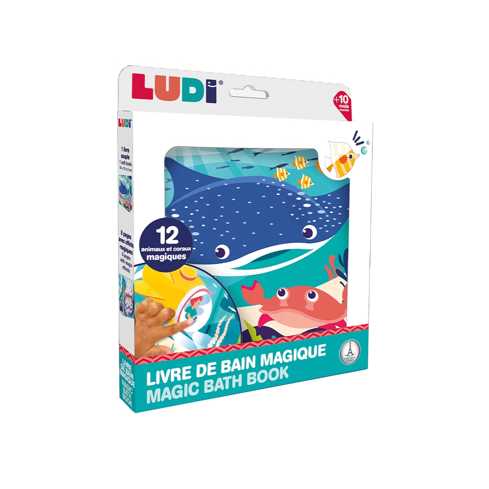 Αδιάβροχο βιβλιαράκι μπάνιου, της εταιρείας Ludi. Βουτήξτε το στο νερό και παρατηρήστε τα ζωάκια να εμφανίζονται μαγικά! Όταν το βιβλίο έρθει σε επαφή με το νερό, οι εικονογραφήσεις του ζωντανεύουν και αποκτούν ζωηρά χρώματα. Κοράλλια και ζώα αποκαλύπτονται μπροστά στα έκπληκτα μάτια του παιδιού. Κάθε σελίδα είναι μια νέα περιπέτεια και αποτελεί ευκαιρία για συζήτηση! Αφήστε το βιβλίο να στεγνώσει και τα ζώα θα κρυφτούν.