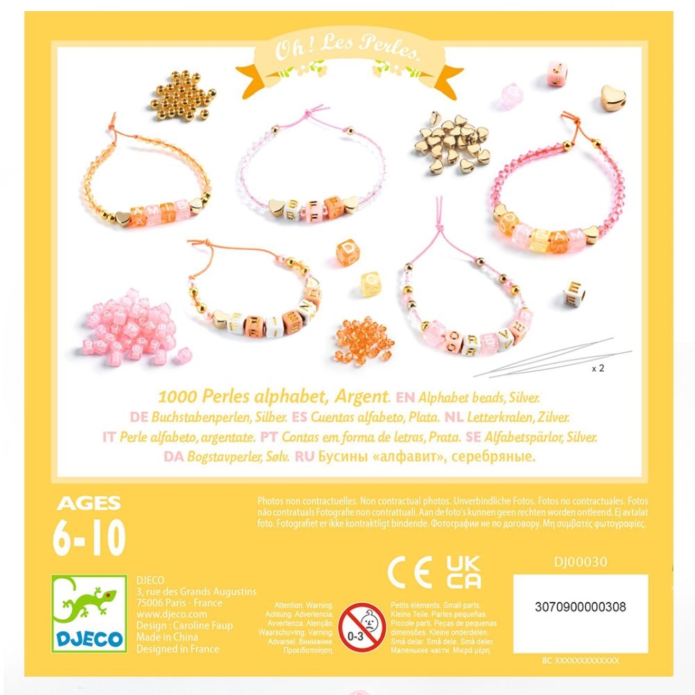 Κατασκευάστε μοναδικά κοσμήματα με λατινικά γράμματα και χάντρες σε χρυσές αποχρώσεις με τις εντυπωσιακές χάντρες της εταιρίας Djeco! Τα παιδιά έχουν την ελευθερία να φτιάξουν κάθε λογής κόσμημα και αξεσουάρ μέσα από μια μεγάλη ποικιλία χαντρών σε διαφορετικά σχέδια, μεγέθη και χρώματα. Δοκιμάστε αμέτρητους συνδυασμούς μέχρι να βρείτε αυτό που σας αρέσει! Μια ευχάριστη και δημιουργική απασχόληση, που εξάπτει τη φαντασία των παιδιών και τους επιτρέπει να εκφράσουν το προσωπικό τους στυλ μέσα από το παιχνίδι ενώ ενισχύει τις λεπτές κινητικές τους δεξιότητες, βοηθά στη συγκέντρωσή τους και αναπτύσσει την αυτοπεποίθησή τους.