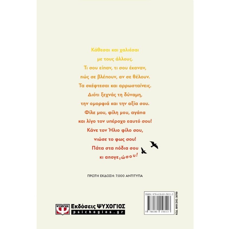 Κάθεσαι και χαλιέσαι με τους άλλους. Τι σου είπαν, τι σου έκαναν, πώς σε βλέπουν, αν σε θέλουν. Τι σκέφτεσαι και αρρωσταίνεις. Διότι ξεχνάς τη δύναμη, την ομορφιά και την αξία σου. Φίλε μου, φίλη μου, αγάπα και λίγο τον υπέροχο εαυτό σου! Κάνε τον Ήλιο φίλο σου, νιώσε το φως σου! Πάτα στα πόδια σου και απογειώσου!