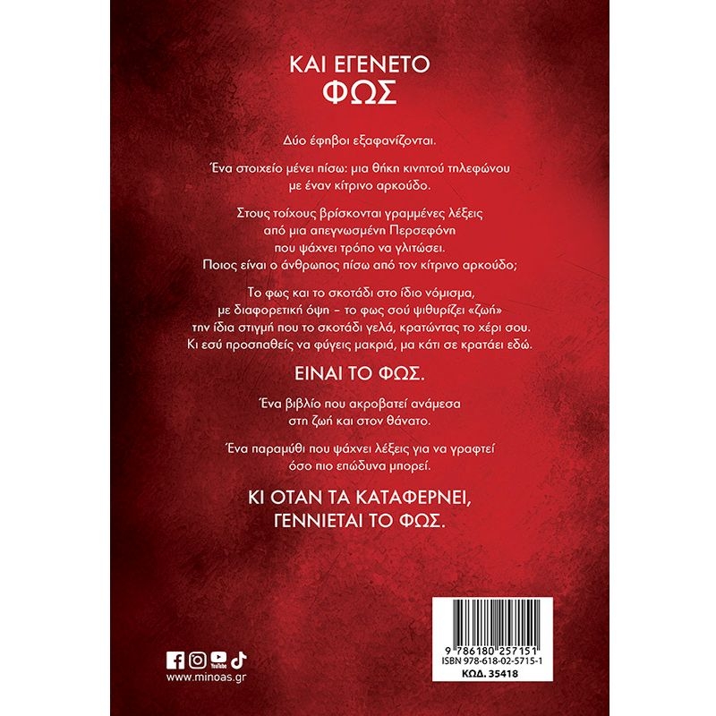 Δύο έφηβοι εξαφανίζονται. Ένα στοιχείο μένει πίσω: μια θήκη κινητού τηλεφώνου με έναν κίτρινο αρκούδο. Στους τοίχους βρίσκονται γραμμένες λέξεις από μια απεγνωσμένη Περσεφόνη που ψάχνει τρόπο να γλιτώσει. Ποιος είναι ο άνθρωπος πίσω από τον κίτρινο αρκούδο; Το φως και το σκοτάδι στο ίδιο νόμισμα, με διαφορετική όψη – το φως σού ψιθυρίζει «ζωή» την ίδια στιγμή που το σκοτάδι γελά, κρατώντας το χέρι σου. Κι εσύ προσπαθείς να φύγεις μακριά, μα κάτι σε κρατάει εδώ. Είναι το φως. Ένα βιβλίο που ακροβατεί ανάμεσα στη ζωή και στον θάνατο. Ένα παραμύθι που ψάχνει λέξεις για να γραφτεί όσο πιο επώδυνα μπορεί. Κι όταν τα καταφέρνει, γεννιέται το φως.