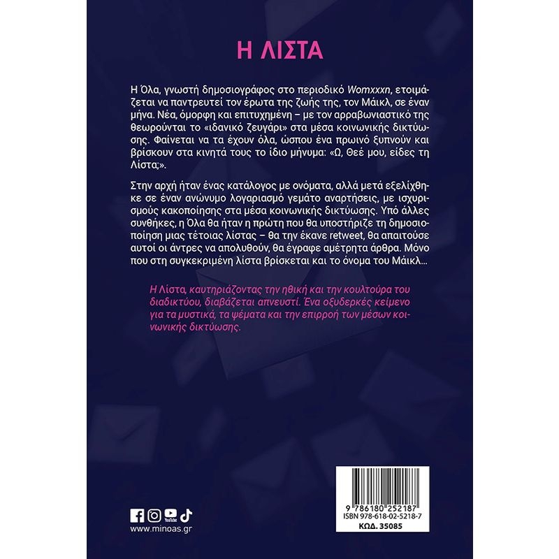 Η Όλα, γνωστή δημοσιογράφος στο περιοδικό Womxxxn, ετοιμάζεται να παντρευτεί τον έρωτα της ζωής της, τον Μάικλ, σε έναν μήνα. Νέα, όμορφη και επιτυχημένη – με τον αρραβωνιαστικό της θεωρούνται το «ιδανικό ζευγάρι» στα μέσα κοινωνικής δικτύωσης. Φαίνεται να τα έχουν όλα, ώσπου ένα πρωινό ξυπνούν και βρίσκουν στα κινητά τους το ίδιο μήνυμα: «Ω, Θεέ μου, είδες τη Λίστα;». Στην αρχή ήταν ένας κατάλογος με ονόματα, αλλά μετά εξελίχθηκε σε έναν ανώνυμο λογαριασμό γεμάτο αναρτήσεις, με ισχυρισμούς κακοποίησης στα μέσα κοινωνικής δικτύωσης. Υπό άλλες συνθήκες, η Όλα θα ήταν η πρώτη που θα υποστήριζε τη δημοσιοποίηση μιας τέτοιας λίστας – θα την έκανε retweet, θα απαιτούσε αυτοί οι άντρες να απολυθούν, θα έγραφε αμέτρητα άρθρα. Μόνο που στη συγκεκριμένη λίστα βρίσκεται και το όνομα του Μάικλ… Η Λίστα, καυτηριάζοντας την ηθική και την κουλτούρα του διαδικτύου, διαβάζεται απνευστί. Ένα οξυδερκές κείμενο για τα μυστικά, τα ψέματα και την επιρροή των μέσων κοινωνικής δικτύωσης.