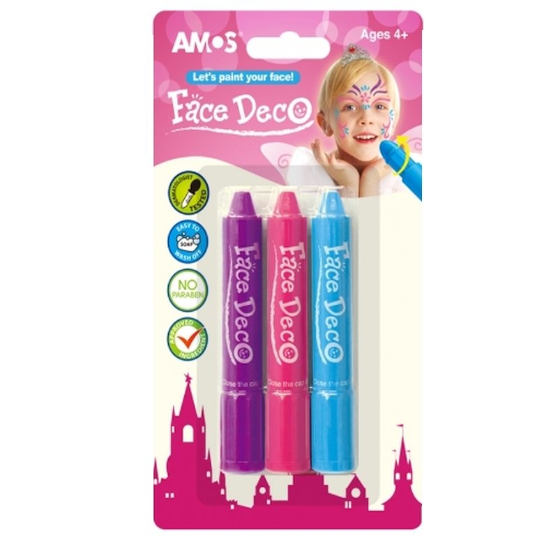 Χρώματα προσώπου Amos Face Deco σετ 3 τεμαχίων. Ανακαλύψτε ένα σύνολο ζωγραφικής για το πρόσωπο από την Amos, ιδανικό για εσάς και το παιδί σας!