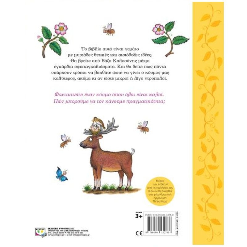Το βιβλίο αυτό είναι γεμάτο με μυριάδες θετικές και αισιόδοξες ιδέες. Θα βρείτε από Βάζα Καλοσύνης μέχρι εγκάρδια σφιχταγκαλιάσματα. Και θα δείτε πως πάντα υπάρχουν τρόποι να βοηθάτε ώστε να γίνει ο κόσμος μας καλύτερος, ακόμα κι αν είστε μικροί ή λίγο ντροπαλοί.Φανταστείτε έναν κόσμο όπου όλοι είναι καλοί. Πώς μπορούμε να τον κάνουμε πραγματικότητα; Μέρος των εσόδων από τις πωλήσεις του βιβλίου θα διατεθεί στη φιλανθρωπική οργάνωση Three Peas.
