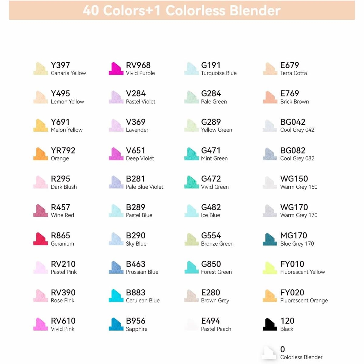 Το σετ διατίθεται σε υπέροχη υφασμάτινη κασετίνα και περιλαμβάνει 41 μαρκαδόρους (39 χρώματα +1 άχρωμος μαρκαδόρος Blender) με διπλή μύτη Fine & Chisel που έχουν ως βάση την αλκοόλη. Είναι κατάλληλοι για εικονογράφηση και σχέδιο. Ιδανικό για παιδιά και ενήλικες