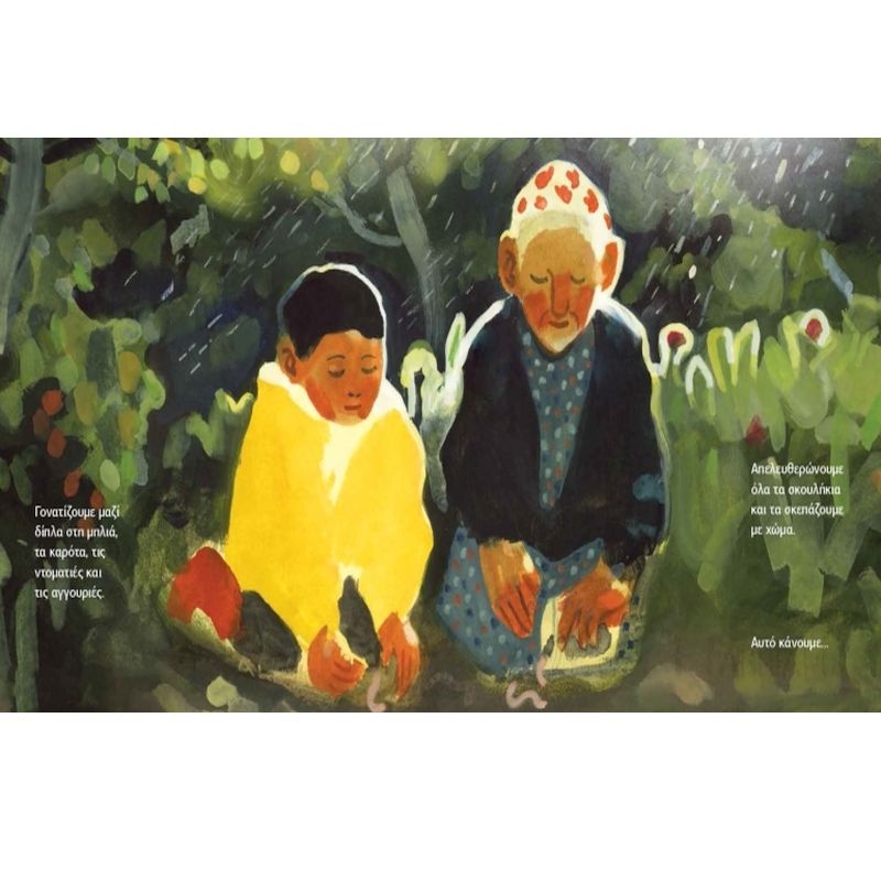 Η γιαγιά μου ζει σε ένα παλιό κοτέτσι, πλάι στην κεντρική λεωφόρο. Μπροστά του ορθώνεται μια χρυσή πυραμίδα από θειάφι, που λάμπει σαν ήλιος…,,, ένας ήλιος που δεν δύει ποτέ. Ένα αγόρι αναπολεί τις στιγμές που περνούσε παρέα με τη γιαγιά του: στην κουζίνα, όταν την έβρισκε κρυμμένη μέσα στους ατμούς από τις πατάτες που έβραζαν, στον μικρό της κήπο, που καλλιεργούσαν μαζί, στους δρόμους, πιασμένοι χέρι-χέρι να ψάχνουν σκουλήκια κάτω από τη βροχή και στο τραπέζι, καθισμένοι πλάι- πλάι να απολαμβάνουν φαγητό από τον κήπο τους. Ο ποιητής Jordan Scott αφηγείται μια προσωπική ιστορία μιλώντας για τα παιδικά του χρόνια στο σπίτι της γιαγιάς του, για τη μεταξύ τους σχέση, τις συνήθειές τους και πώς αυτές καθόρισαν τον τρόπου που εκείνος αντιλαμβάνεται τον κόσμο. Ο βραβευμένος με Hans Christian Andersen και Greenaway Award Sydney Smith εικονογραφεί τις σελίδες με έναν μαγικό τρόπο, που ξυπνά όλες τις αισθήσεις.