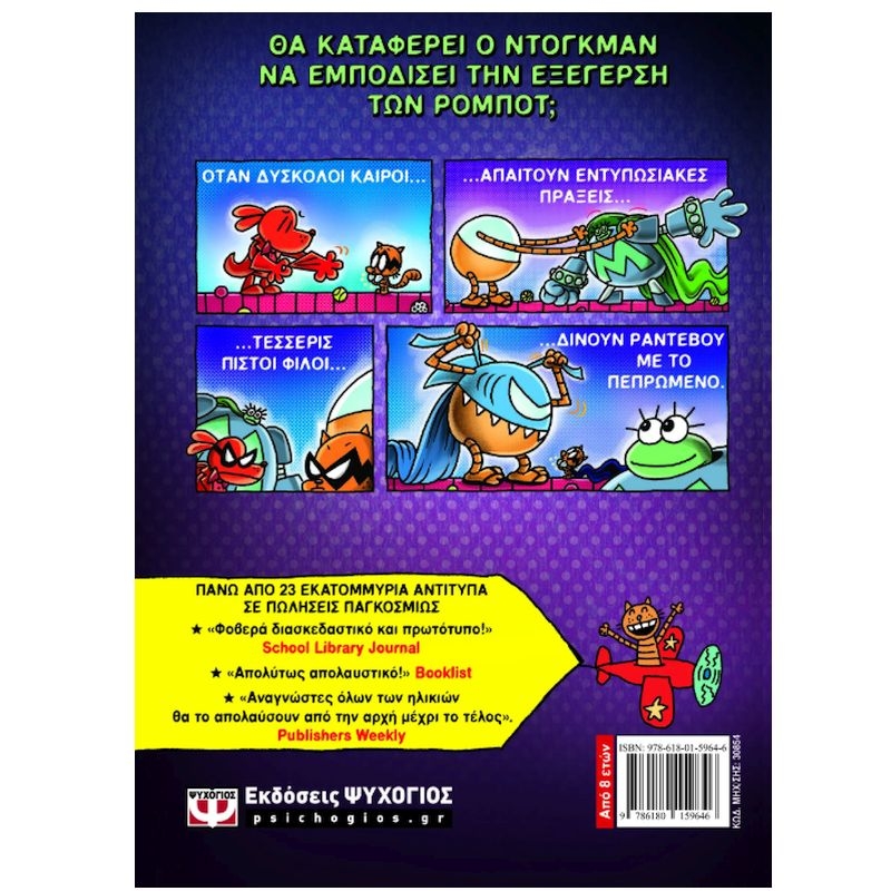 Πιφ! Τον Ντόγκμαν τον ψέκασε ασβός! Έπειτα από ένα καλό πλύσιμο με χυμό ντομάτας, η δυσωδία έφυγε, του έμεινε όμως το κόκκινο χρώμα… Ο γενναίος υπερήρωας, εξόριστος πια, παλεύει να σώσει τους πολίτες που τον απομόνωσαν! Από την άλλη ο Πίτι, για να τον βοηθήσει, αναγκάζεται να επιστρέψει στο έγκλημα. Άραγε ο σκοπός θα αγιάσει τα μέσα; Και ποιος θα τολμήσει να πολεμήσει αυτόν τον καινούριο, ολοκαίνουριο, παντελώς άγνωστο κακό, που έχει εξαπολύσει έναν στρατό από ρομπότ τεχνητής νοημοσύνης;