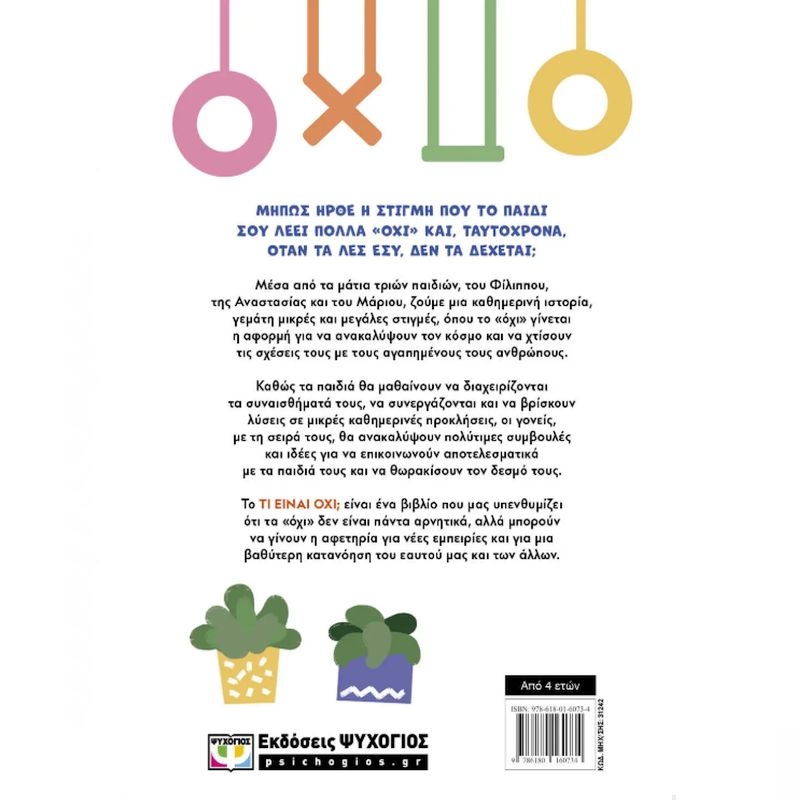 Μήπως ήρθε η στιγμή που το παιδί σου λέει πολλά «όχι» και, ταυτόχρονα, όταν τα λες εσύ, δεν τα δέχεται; Μέσα από τα μάτια τριών παιδιών, του Φίλιππου, της Αναστασίας και του Μάριου, ζούμε μια καθημερινή ιστορία, γεμάτη μικρές και μεγάλες στιγμές, όπου το «όχι» γίνεται η αφορμή για να ανακαλύψουν τον κόσμο και να χτίσουν τις σχέσεις τους με τους αγαπημένους τους ανθρώπους. Καθώς τα παιδιά θα μαθαίνουν να διαχειρίζονται τα συναισθήματά τους, να συνεργάζονται και να βρίσκουν λύσεις σε μικρές καθημερινές προκλήσεις, οι γονείς, με τη σειρά τους, θα ανακαλύψουν πολύτιμες συμβουλές και ιδέες για να επικοινωνούν αποτελεσματικά με τα παιδιά τους και να θωρακίσουν τον δεσμό τους. Το ΤΙ ΕΙΝΑΙ ΟΧΙ; είναι ένα βιβλίο που μας υπενθυμίζει ότι τα «όχι» δεν είναι πάντα αρνητικά, αλλά μπορούν να γίνουν η αφετηρία για νέες εμπειρίες και για μια βαθύτερη κατανόηση του εαυτού μας και των άλλων.