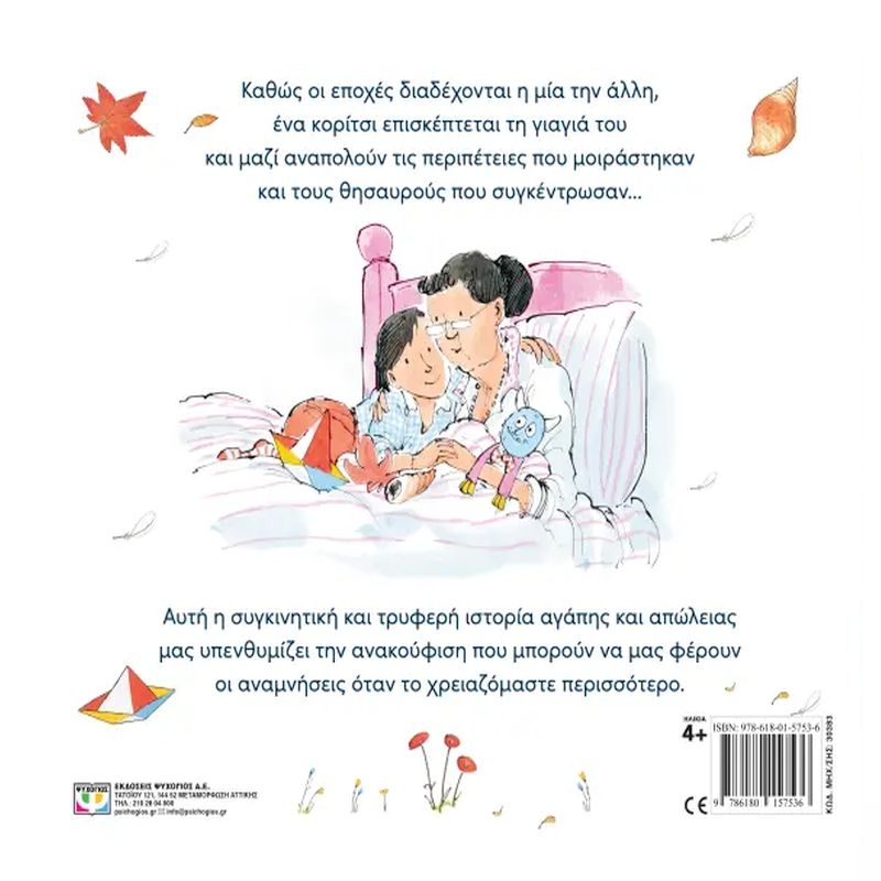Καθώς οι εποχές διαδέχονται η μία την άλλη, ένα κορίτσι επισκέπτεται τη γιαγιά του και μαζί αναπολούν τις περιπέτειες που μοιράστηκαν και τους θησαυρούς που συγκέντρωσαν...Αυτή η συγκινητική και τρυφερή ιστορία αγάπης και απώλειας μας υπενθυμίζει την ανακούφιση που μπορούν να μας φέρουν οι αναμνήσεις όταν το χρειαζόμαστε περισσότερο.