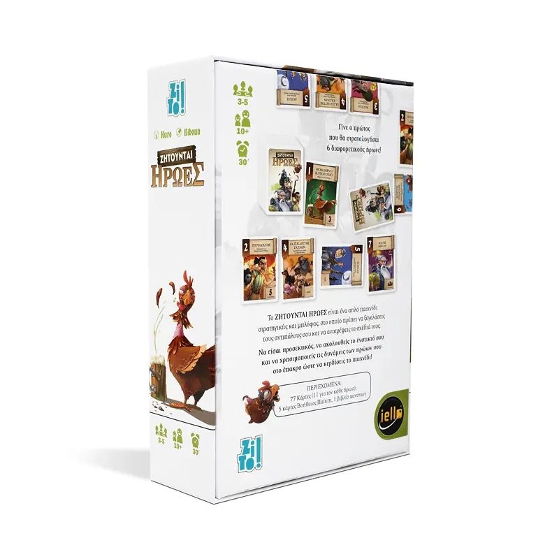Γίνε ο πρώτος που θα στρατολογήσει 6 διαφορετικούς ήρωες! Το ΖΗΤΟΥΝΤΑΙ ΗΡΩΕΣ είναι ένα απλό παιχνίδι στρατηγικής και μπλόφας, στο οποίο πρέπει να ξεγελάσεις τους αντιπάλους σου και να ανατρέψεις τα σχέδιά τους. Να είσαι προσεκτικός, να ακολουθείς το ένστικτό σου και να χρησιμοποιείς τις δυνάμεις των ηρώων σου στο έπακρο ώστε να κερδίσεις το παιχνίδι!