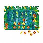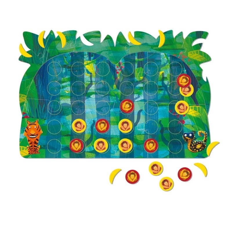 Περιλαμβάνει: ένα πίνακα παιχνιδιού ζούγκλας, 30 “ορανγκουτάν” μάρκες, 8 μπανάνες, 2 μπανάνες σε τσαμπί” πίνακες σκορ, οδηγίες παιχνιδιού.