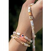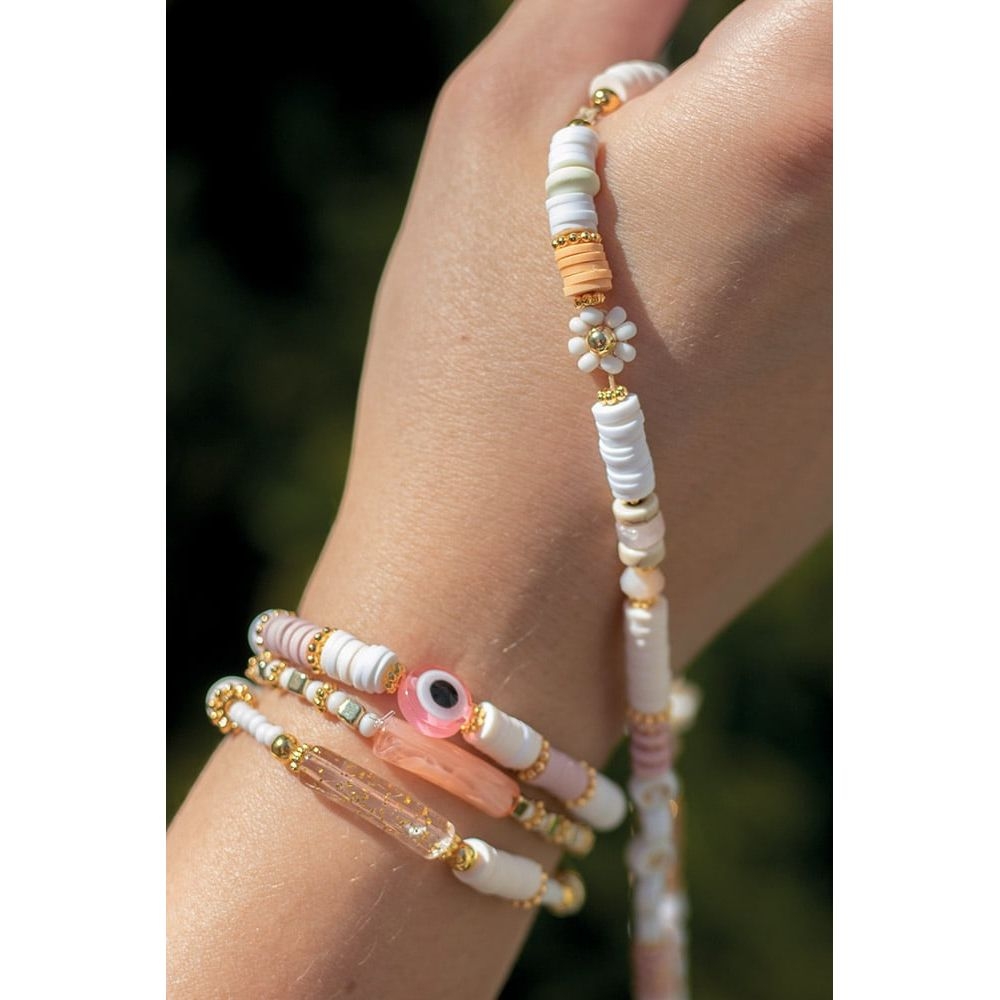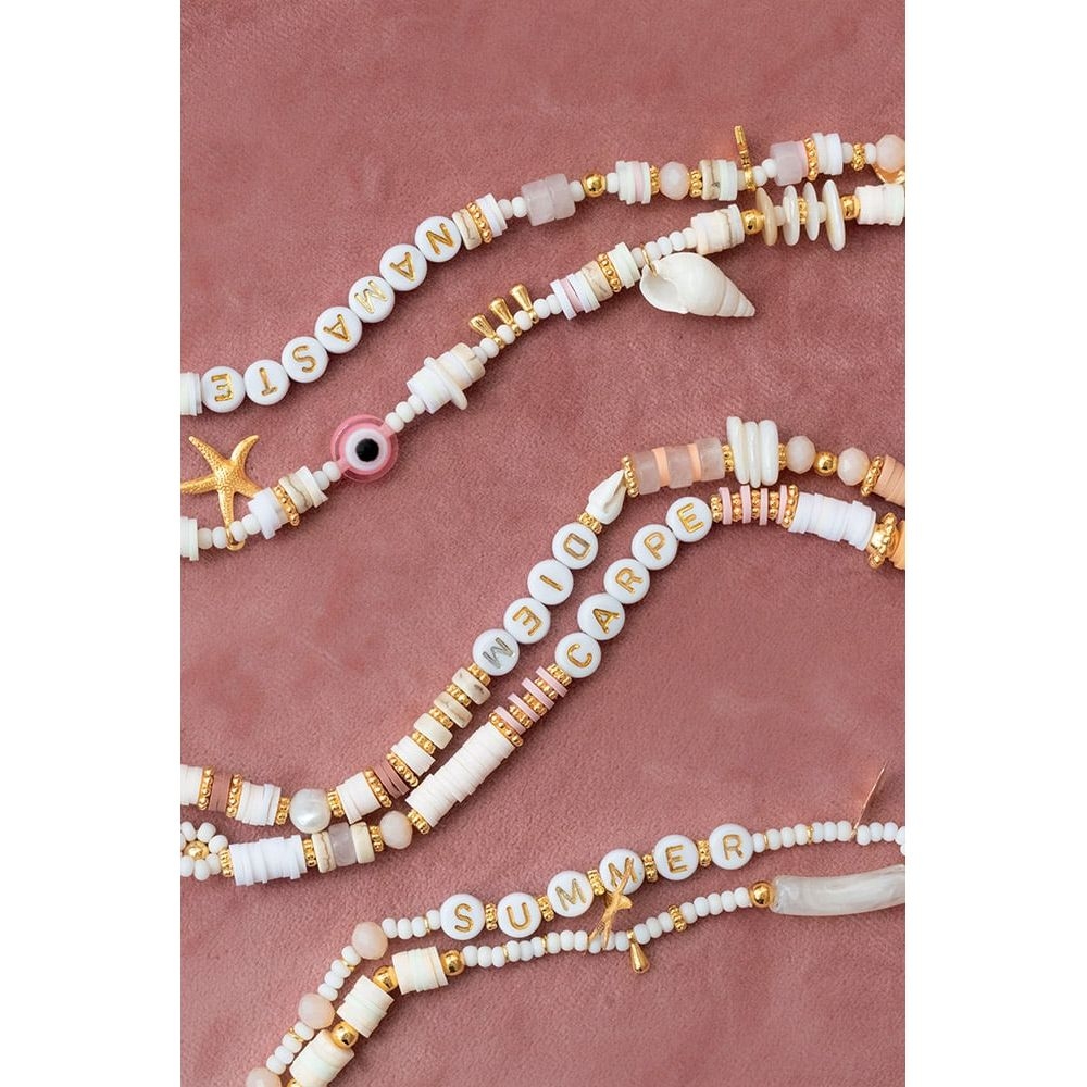 Περιλαμβάνει: 1 σακουλάκι με μεταλλικά εξαρτήματα και χάντρες ποικιλίας (Heishi, φυσικές, ροκαΐγ, ενδιάμεσες), 4 σωληνωτές χάντρες, χάντρες με γράμματα “carpe diem”, 1 καρούλι με ελαστικό διαφανές νήμα, 2 μέτρα κορδόνι jade (μπεζ), 1 βελόνα και 1 φυλλάδιο οδηγιών.