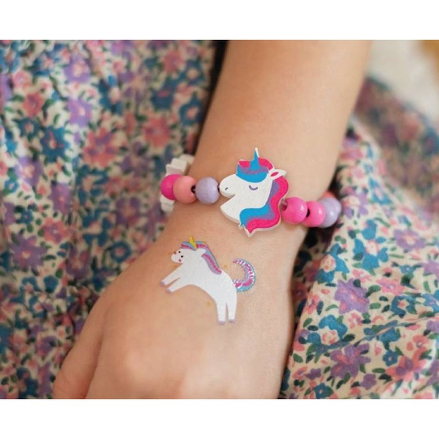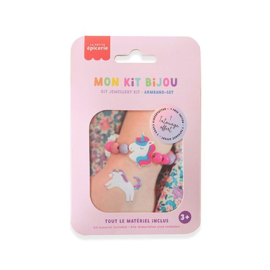 Αυτό το χαριτωμένο παιδικό κιτ κοσμήματος θα ενθουσιάσει το μικρό σας με το πολύχρωμο βραχιόλι μονόκερος! Η La Petite Épicerie σχεδίασε αυτό το κιτ ειδικά για τους μικρούς δημιουργούς. Είναι εύκολο στην κατασκευή και περιλαμβάνει όλα τα υλικά που χρειάζεται το παιδί σας για να δημιουργήσει ένα υπέροχο βραχιόλι με ξύλινες χάντρες – στρογγυλές και σε σχήμα μονόκερου! Οι ξύλινες χάντρες έχουν ιδανικό μέγεθος για μικρά χεράκια, ώστε να μπορούν εύκολα να τις πιάσουν και να τις περάσουν στο ελαστικό νήμα – όπως οι μεγάλοι! Μόλις το ολοκληρώσει, σίγουρα δεν θα θέλει να το βγάλει από το χέρι του! Είναι χαρούμενο, πολύχρωμο και... πανέμορφο! Το κιτ περιλαμβάνει και ένα προσωρινό τατουάζ με ένα μονόκερο για έναν ολοκληρωμένο χρωματιστό look! Ιδανική επιλογή για δώρο γενεθλίων ή μικρό αναμνηστικό δώρο σε παιδικά πάρτι.