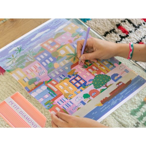 Μια λαμπερή απόδραση στη Μεσόγειο, μέσα από το Petit Diamond Maisons Colorées της La Petite Épicerie. Το συγκεκριμένο κιτ diamond painting σας προσκαλεί σε ένα οπτικό ταξίδι γεμάτο χρώματα, φως και θετική ενέργεια. Η εικονογράφηση απεικονίζει έναν λόφο γεμάτο ζωηρά, μεσογειακά σπιτάκια σε αποχρώσεις του μπλε, ροζ, πορτοκαλί και κίτρινου, να αγκαλιάζουν την καταπράσινη πλαγιά που καταλήγει σε γαλαζοπράσινα νερά. Κάθε μικρό διαμαντάκι προσθέτει βάθος και λάμψη στη σκηνή, δίνοντας ζωή στο τοπίο με τρόπο μαγευτικό.