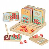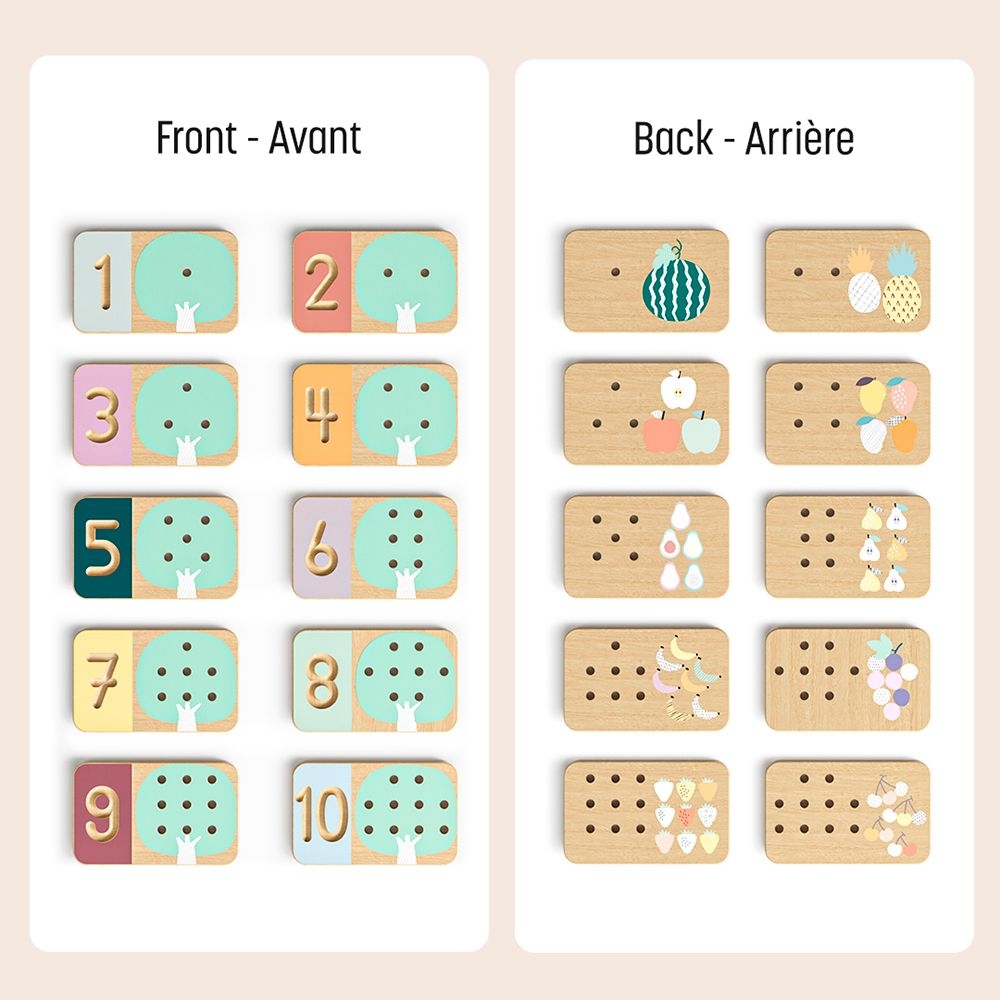 Ένα μινιμαλιστικό και άψογα κατασκευασμένο παιχνίδι Montessori που εισάγει τα παιδιά ηλικίας 3 ετών και άνω στον κόσμο των αριθμών και της αριθμητικής με φυσικό και διασκεδαστικό τρόπο. Το παιδί τοποθετεί τον σωστό αριθμό από μικρά κόκκινα μήλα στο δεντράκι κάθε κάρτας, ενώ με το ειδικό μολύβι μπορεί να σχεδιάζει το περίγραμμα κάθε αριθμού πάνω στις ξύλινες πλακέτες. Καθώς παίζει, το μικρό παιδί αναπτύσσει τις κινητικές του δεξιότητες και μαθαίνει να αναγνωρίζει χρώματα. Τα μεγαλύτερα παιδιά εξοικειώνονται με τις βασικές μαθηματικές πράξεις, προετοιμάζοντας έτσι το έδαφος για μελλοντική σχολική επιτυχία. Στην πίσω πλευρά κάθε καρτέλας υπάρχουν εικόνες με διαφορετικά φρούτα, ενισχύοντας το λεξιλόγιο των παιδιών.