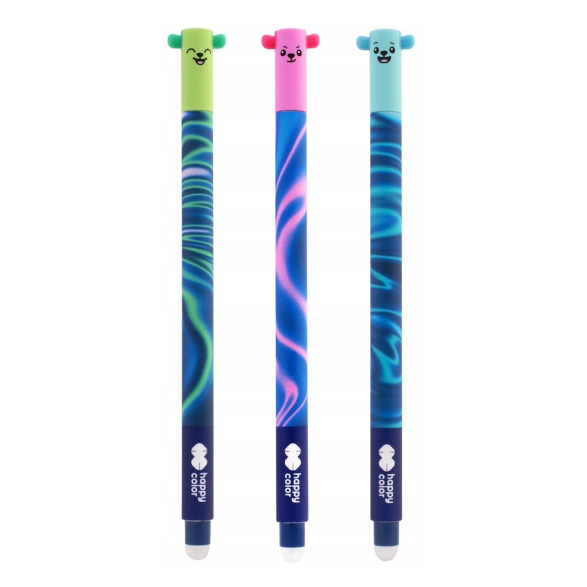 Ένα ιδιαίτερο στυλό της εταιρίας Happy Color σε 3 όμορφα σχέδια! Το ειδικό μελάνι gel είναι ευαίσθητο στην θερμότητα, ώστε να μπορείτε να σβήνετε τα λάθη σας τρίβοντας τη με την ειδική σβήστρα στο καπάκι! Η λεπτή μύτη 0.5mm εξασφαλίζει καθαρή και ευανάγνωστη γραφή, ενώ η ενσωματωμένη γόμα στο πίσω μέρος επιτρέπει την άμεση διόρθωση χωρίς μουτζούρες ή φθορές στο χαρτί.
