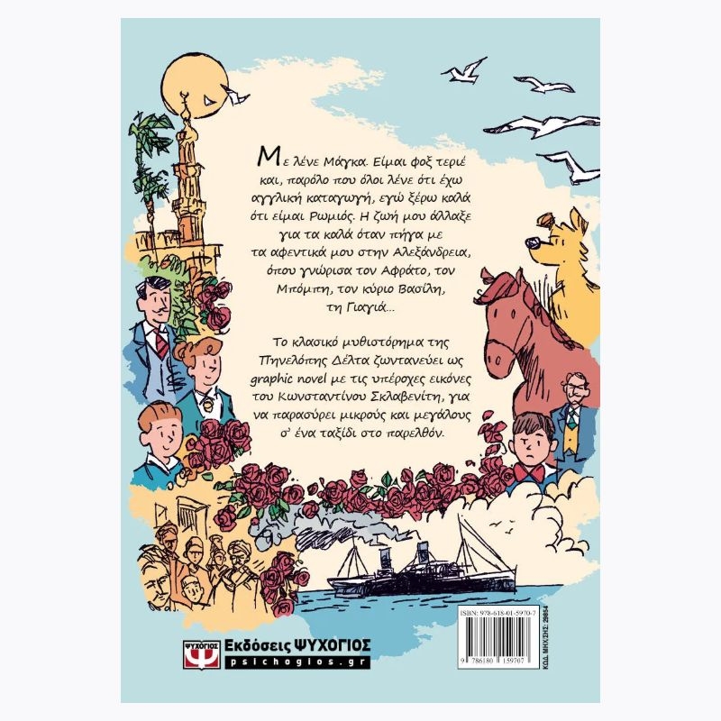 Με λένε Μάγκα. Είμαι φοξ τεριέ και, παρόλο που όλοι λένε ότι έχω αγγλική καταγωγή, εγώ ξέρω καλά ότι είμαι Ρωμιός. Η ζωή μου άλλαξε για τα καλά όταν πήγα με τα αφεντικά μου στην Αλεξάνδρεια, όπου γνώρισα τον Αφράτο, τον Μπόμπη, τον κύριο Βασίλη, τη Γιαγιά…Το κλασικό μυθιστόρημα της Πηνελόπης Δέλτα ζωντανεύει ως graphic novel με τις υπέροχες εικόνες του Κωνσταντίνου Σκλαβενίτη, για να παρασύρει μικρούς και μεγάλους σ’ ένα ταξίδι στο παρελθόν.