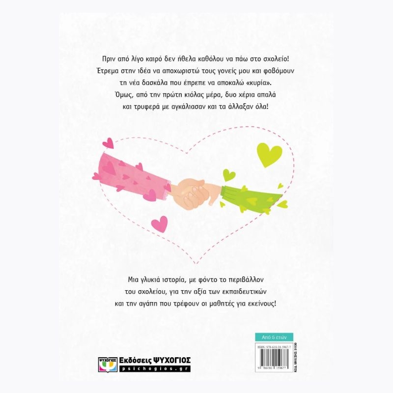 Πριν από λίγο καιρό δεν ήθελα καθόλου να πάω στο σχολείο! Έτρεμα στην ιδέα να αποχωριστώ τους γονείς μου και φοβόμουν τη νέα δασκάλα που έπρεπε να αποκαλώ «κυρία». Όμως, από την πρώτη κιόλας μέρα, δυο χέρια απαλά και τρυφερά με αγκάλιασαν και τα άλλαξαν όλα! Μια γλυκιά ιστορία, με φόντο το περιβάλλον του σχολείου, για την αξία των εκπαιδευτικών και την αγάπη που τρέφουν οι μαθητές για εκείνους!