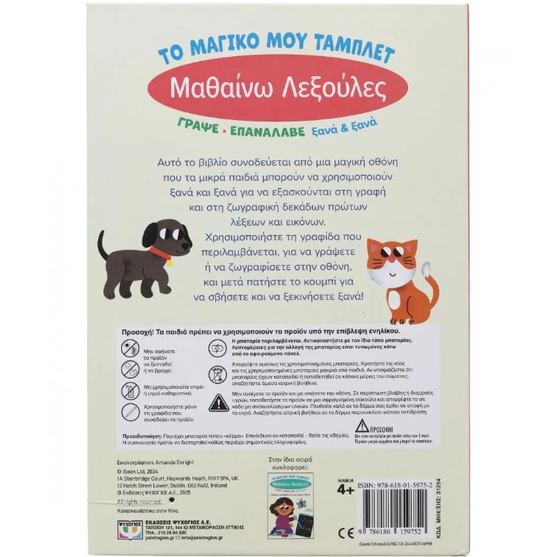 Αυτό το βιβλίο συνοδεύεται από μια μαγική οθόνη που τα μικρά παιδιά μπορούν να χρησιμοποιούν ξανά και ξανά για να εξασκούνται στη γραφή και στη ζωγραφική δεκάδων πρώτων λέξεων και εικόνων. Χρησιμοποιήστε τη γραφίδα που περιλαμβάνεται για να γράψετε ή να ζωγραφίσετε στην οθόνη, και μετά πατήστε το κουμπί για να σβήσετε και να ξεκινήσετε ξανά!