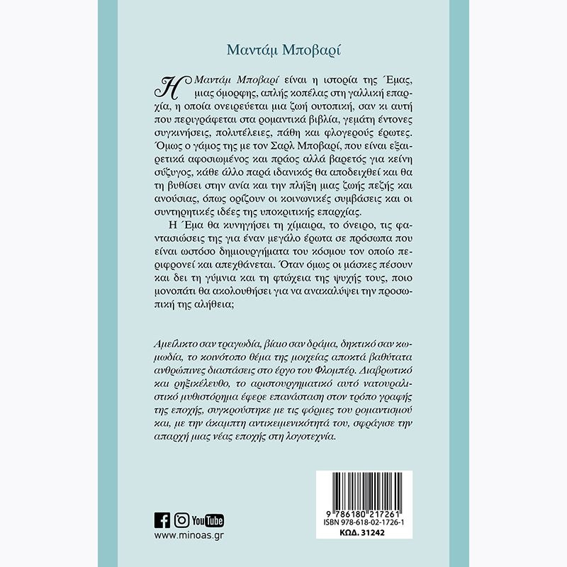 H Μαντάμ Μποβαρί είναι η ιστορία της Έμας, μιας όμορφης, απλής κοπέλας στη γαλλική επαρχία, η οποία ονειρεύεται μια ζωή ουτοπική, σαν κι αυτή που περιγράφεται στα ρομαντικά βιβλία, γεμάτη έντονες συγκινήσεις, πολυτέλειες, πάθη και φλογερούς έρωτες. Όμως ο γάμος της με τον Σαρλ Μποβαρί, που είναι εξαιρετικά αφοσιωμένος και πράος αλλά βαρετός για κείνη σύζυγος, κάθε άλλο παρά ιδανικός θα αποδειχθεί και θα τη βυθίσει στην ανία και την πλήξη μιας ζωής πεζής και ανούσιας, όπως ορίζουν οι κοινωνικές συμβάσεις και οι συντηρητικές ιδέες της υποκριτικής επαρχίας. Η Έμα θα κυνηγήσει τη χίμαιρα, το όνειρο, τις φαντασιώσεις της για έναν μεγάλο έρωτα σε πρόσωπα που είναι ωστόσο δημιουργήματα του κόσμου τον οποίο περιφρονεί και απεχθάνεται. Όταν όμως οι μάσκες πέσουν και δει τη γύμνια και τη φτώχεια της ψυχής τους, ποιο μονοπάτι θα ακολουθήσει για να ανακαλύψει την προσωπική της αλήθεια; Αμείλικτο σαν τραγωδία, βίαιο σαν δράμα, δηκτικό σαν κωμωδία, το κοινότοπο θέμα της μοιχείας αποκτά βαθύτατα ανθρώπινες διαστάσεις στο έργο του Φλομπέρ. Διαβρωτικό και ρηξικέλευθο, το αριστουργηματικό αυτό νατουραλιστικό μυθιστόρημα έφερε επανάσταση στον τρόπο γραφής της εποχής, συγκρούστηκε με τις φόρμες του ρομαντισμού και, με την άκαμπτη αντικειμενικότητά του, σφράγισε την απαρχή μιας νέας εποχής στη λογοτεχνία.
