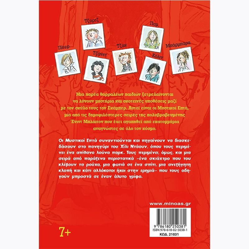 Μια παρέα θαρραλέων παιδιών ξετρελαίνονται να λύνουν μυστήρια και σκοτεινές υποθέσεις μαζί με τον σκύλο τους τον Σκάμπερ. Αυτοί είναι οι Μυστικοί Επτά, μία από τις δημοφιλέστερες σειρές της πολυβραβευμένης Ένιντ Μπλάιτον που έχει αγαπηθεί από εκατομμύρια αναγνώστες σε όλο τον κόσμο. Οι Μυστικοί Επτά συναντιούνται και πηγαίνουν να διασκεδάσουν στο πανηγύρι του Χίλι Ντάουν, όπου τους περιμένει ένα απίθανο λούνα παρκ. Τους περιμένει, όμως, και μια σειρά από παράξενα περιστατικά ένα σκιάχτρο που του κλέβουν τα ρούχα, μια φωτιά σε ένα σπίτι, μια ανεξήγητη κλοπή και κάτι αλλόκοτοι ήχοι στην ερημιά– που τους οδηγούν μπροστά σε έναν άλυτο γρίφο.