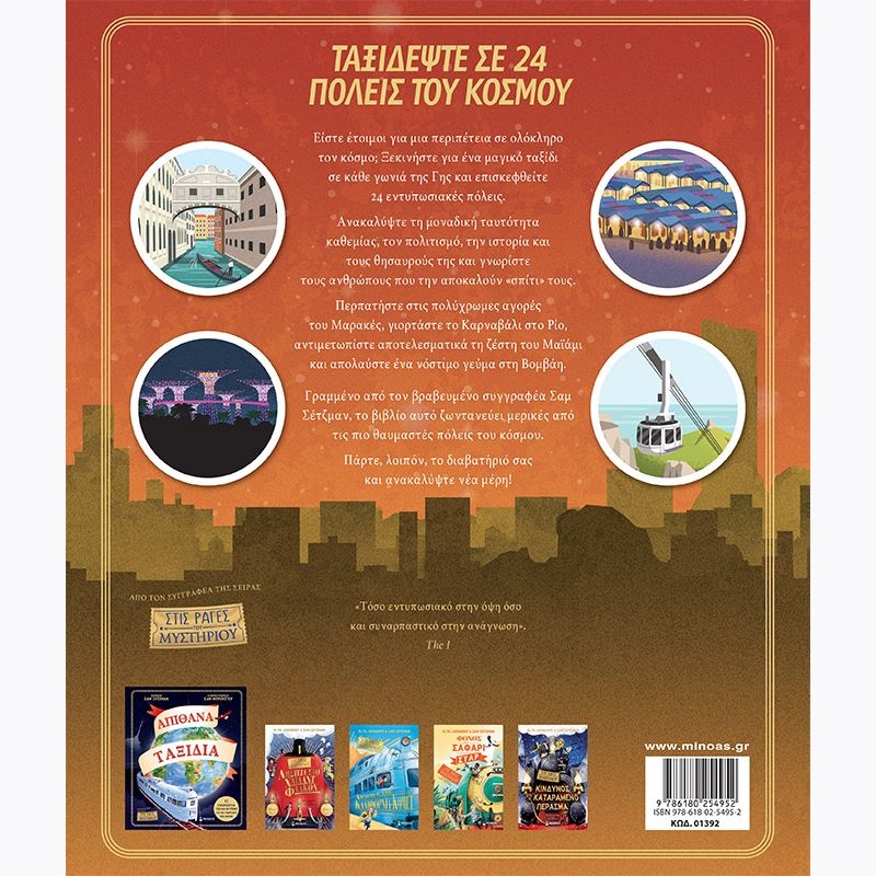 Είστε έτοιμοι για μια περιπέτεια σε ολόκληρο τον κόσμο; Ξεκινήστε για ένα μαγικό ταξίδι σε κάθε γωνιά της Γης και επισκεφθείτε 24 εντυπωσιακές πόλεις. Ανακαλύψτε τη μοναδική ταυτότητα καθεμίας, τον πολιτισμό, την ιστορία και τους θησαυρούς της και γνωρίστε τους ανθρώπους που την αποκαλούν «σπίτι» τους. Περπατήστε στις πολύχρωμες αγορές του Μαρακές, γιορτάστε το Καρναβάλι στο Ρίο, αντιμετωπίστε αποτελεσματικά τη ζέστη του Μαϊάμι και απολαύστε ένα νόστιμο γεύμα στη Βομβάη. Γραμμένο από τον βραβευμένο συγγραφέα Σαμ Σέτζμαν, το βιβλίο αυτό ζωντανεύει μερικές από τις πιο θαυμαστές πόλεις του κόσμου. Πάρτε, λοιπόν, το διαβατήριό σας και ανακαλύψτε νέα μέρη!