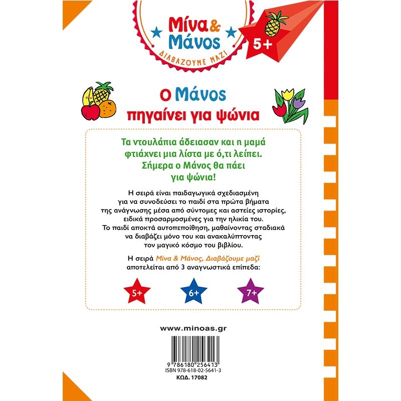 Τα ντουλάπια άδειασαν και η μαμά φτιάχνει μια λίστα με ό,τι λείπει. Σήμερα ο Μάνος θα πάει για ψώνια! Η σειρά είναι παιδαγωγικά σχεδιασμένη για να συνοδεύσει το παιδί στα πρώτα βήματα της ανάγνωσης μέσα από σύντομες και αστείες ιστορίες, ειδικά προσαρμοσμένες για την ηλικία του. Το παιδί αποκτά αυτοπεποίθηση, μαθαίνοντας σταδιακά να διαβάζει μόνο του και ανακαλύπτοντας τον μαγικό κόσμο του βιβλίου.