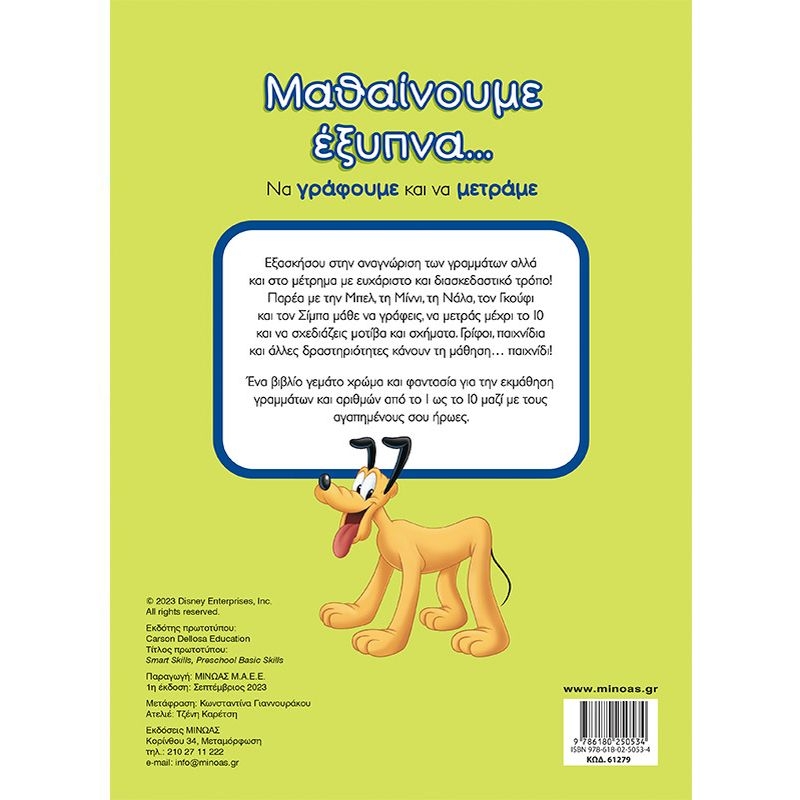 Εξασκήσου στην αναγνώριση των γραμμάτων αλλά και στο μέτρημα με ευχάριστο και διασκεδαστικό τρόπο! Παρέα με την Μπελ, τη Μίννι, τη Νάλα, τον Γκούφι και τον Σίμπα μάθε να γράφεις, να μετράς μέχρι το 10 και να σχεδιάζεις μοτίβα και σχήματα. Γρίφοι, παιχνίδια και άλλες δραστηριότητες κάνουν τη μάθηση… παιχνίδι! Ένα βιβλίο γεμάτο χρώμα και φαντασία για την εκμάθηση γραμμάτων και αριθμών από το 0 ως το 10 μαζί με τους αγαπημένους σου ήρωες.