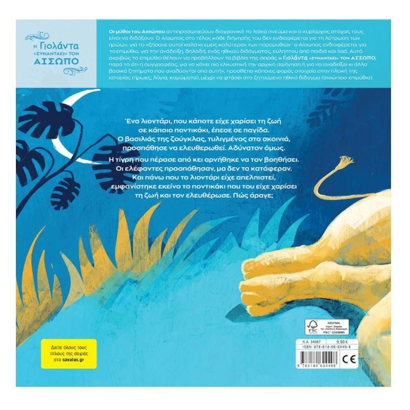 Ένα λιοντάρι, που κάποτε είχε χαρίσει τη ζωή σε κάποιο ποντικάκι, έπεσε σε παγίδα. Ο βασιλιάς της ζούγκλας, τυλιγμένος στα σκοινιά, προσπάθησε να ελευθερωθεί. Αδύνατον όμως. Η τίγρη που πέρασε από κει αρνήθηκε να το βοηθήσει. Οι ελέφαντες προσπάθησαν, μα δεν τα κατάφεραν. Και πάνω που το λιοντάρι είχε απελπιστεί, εμφανίστηκε εκείνο το ποντικάκι που του είχε χαρίσει τη ζωή και τον ελευθέρωσε. Πώς άραγε;